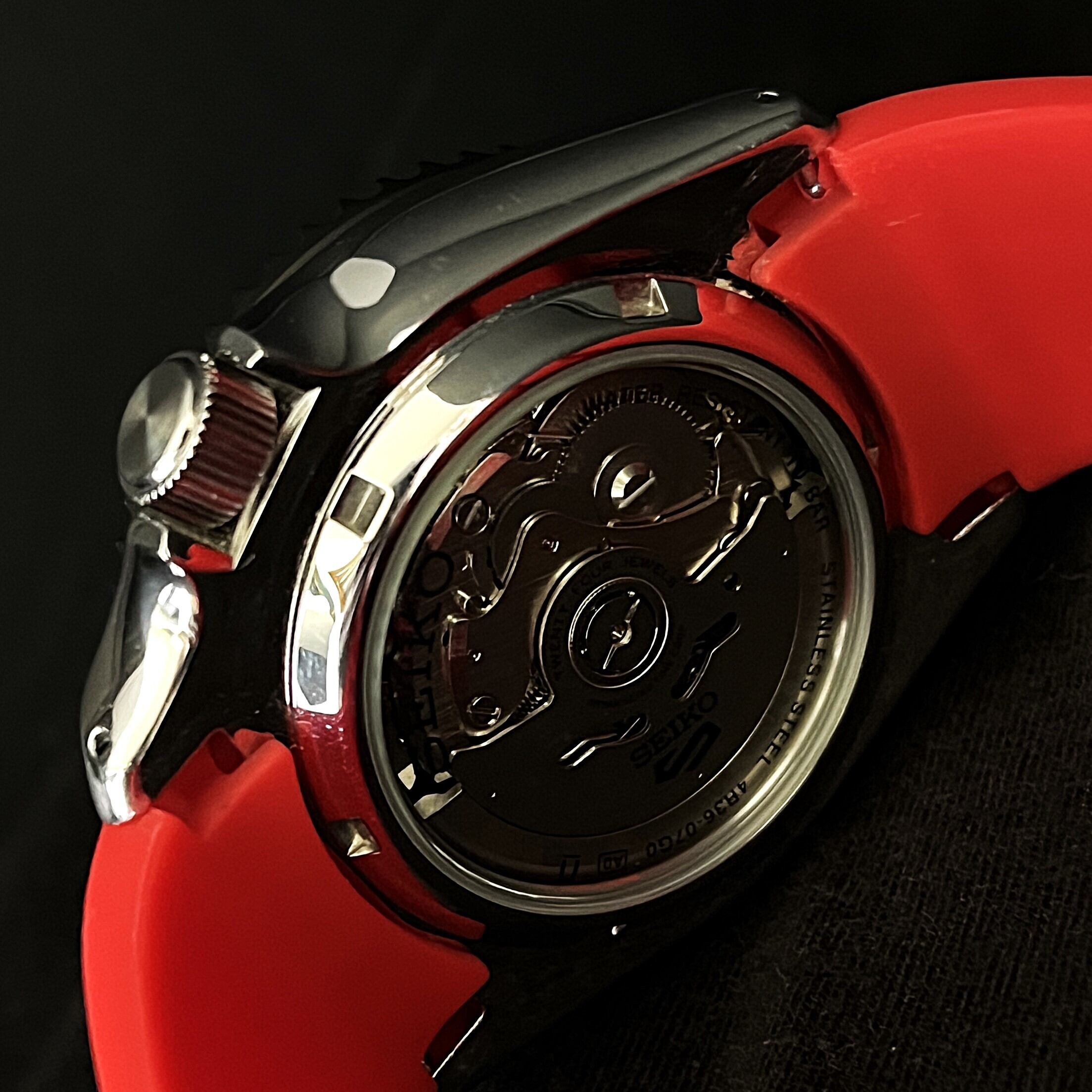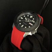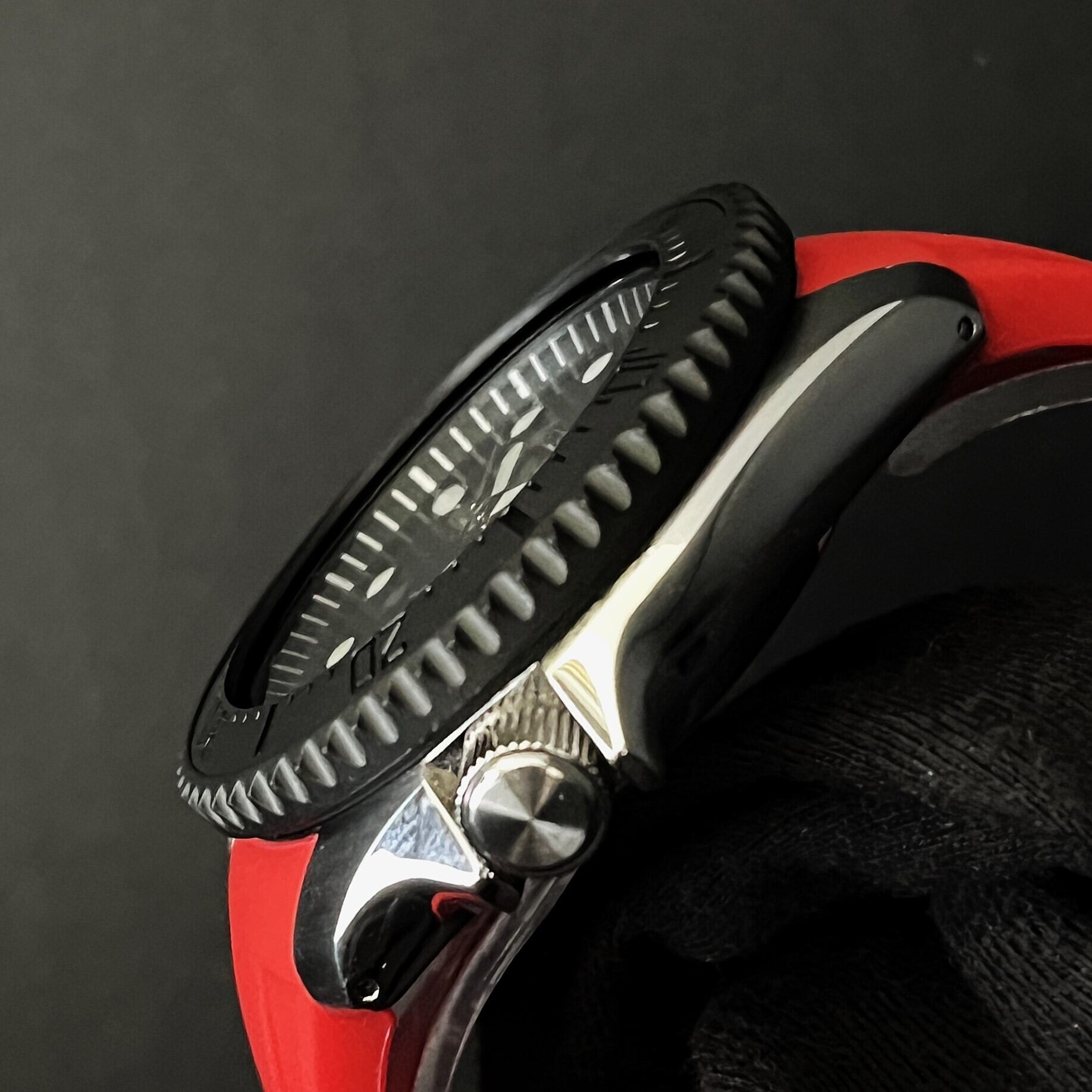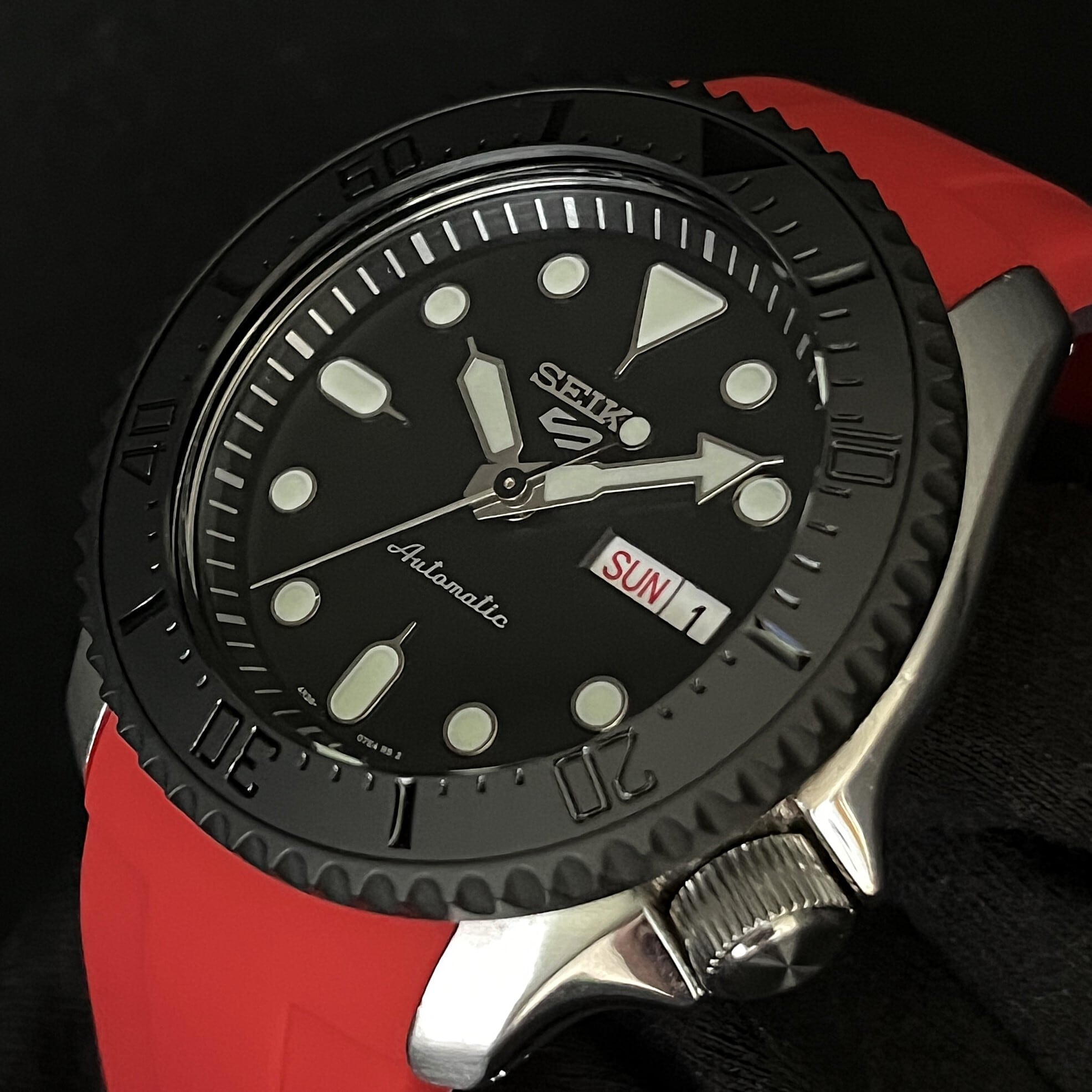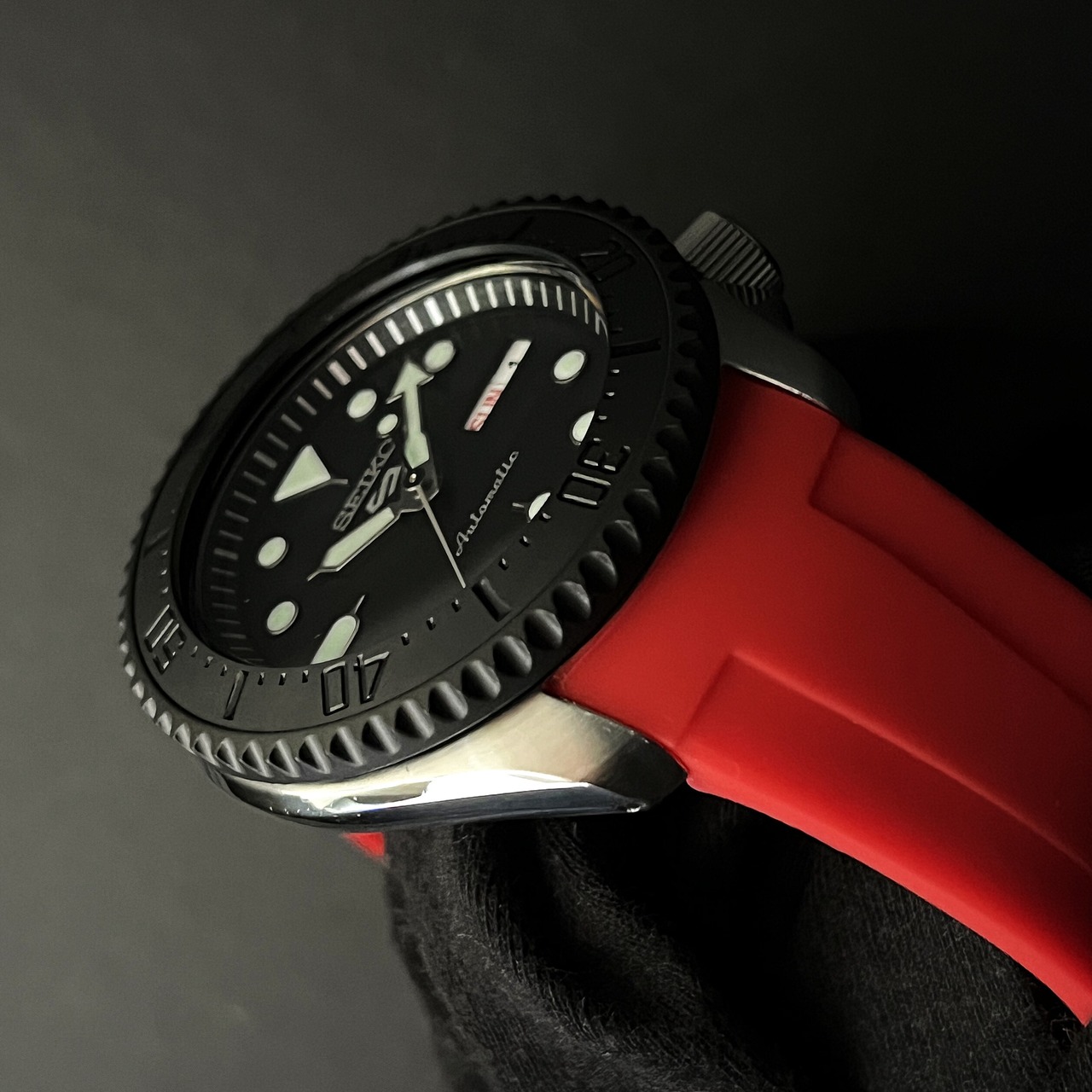 ご購入頂いたSEIKO5Sportsブラックフェイスに、サブマリーナタイプベゼル(ブラッシュドブラック)を組込み、そこにディープシータイプベゼルインサート(ステルス)をセット、クラシックラバーバンドソフトウレタン(レッド)を合わせた情熱的なイメージのmod企画です。