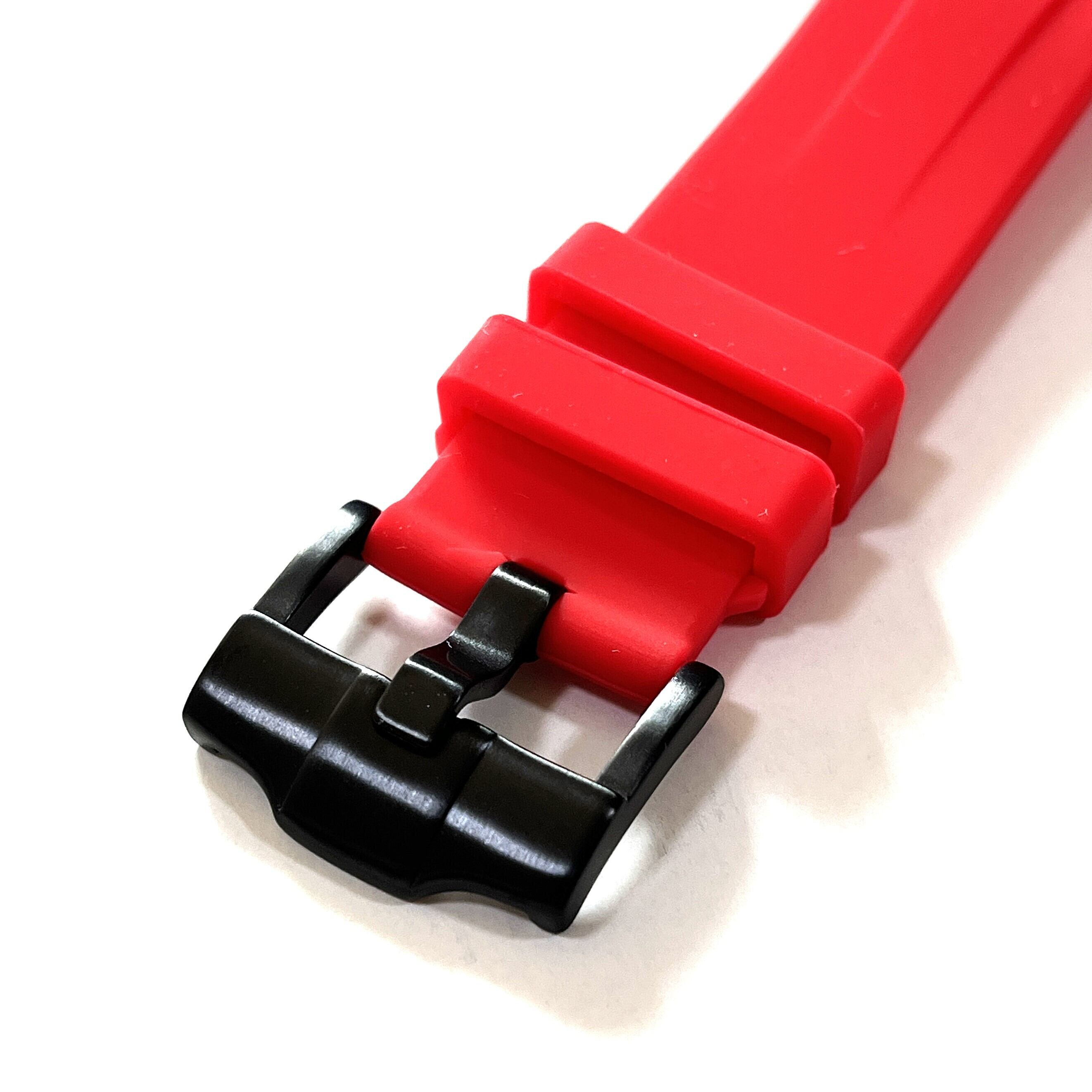 マットなブラックでまとめられたフェイスに鮮やかなレッドカラーが印象的なクラシックラバーバンドを合わせ、時計自体の存在を強調できるデザイン構成となっています。