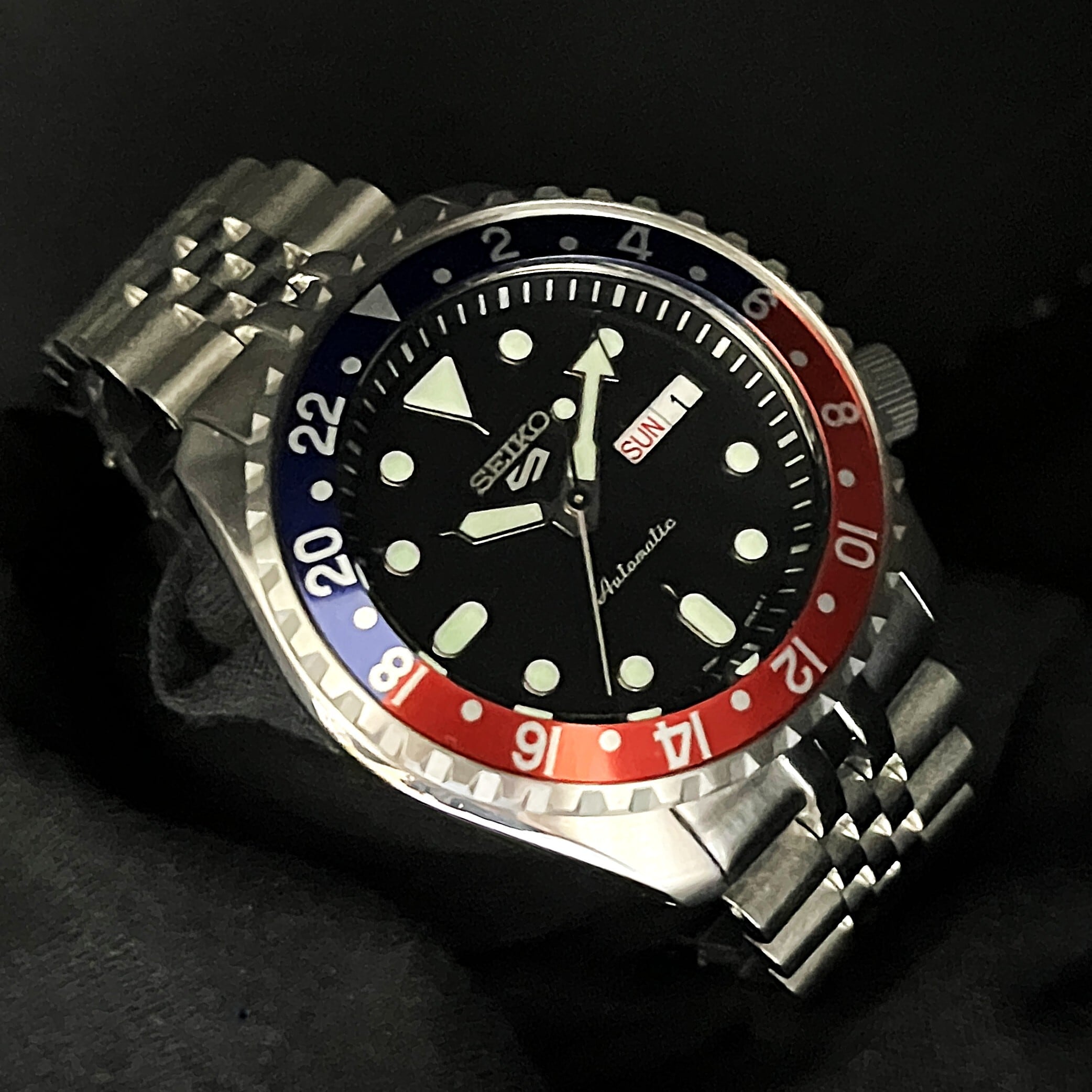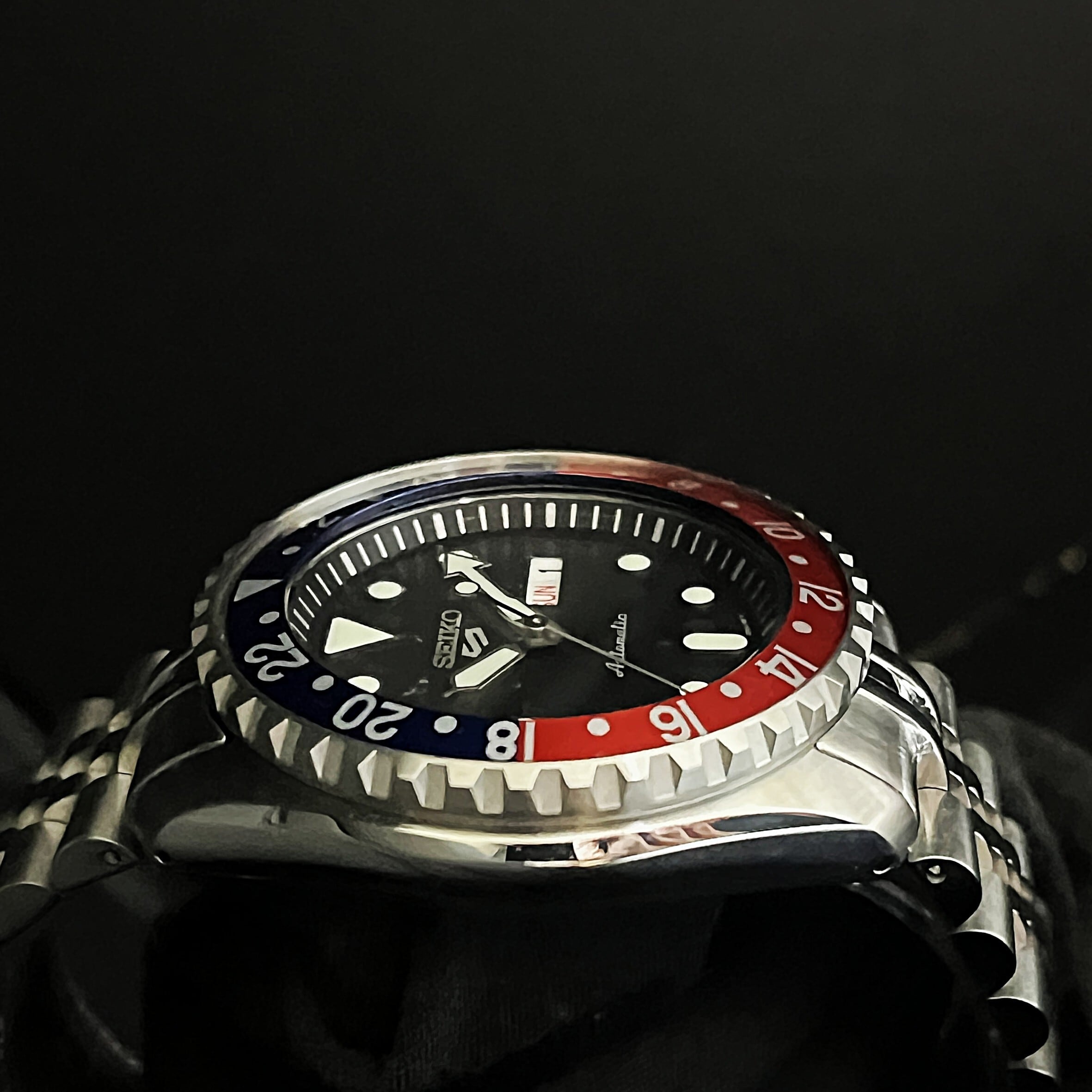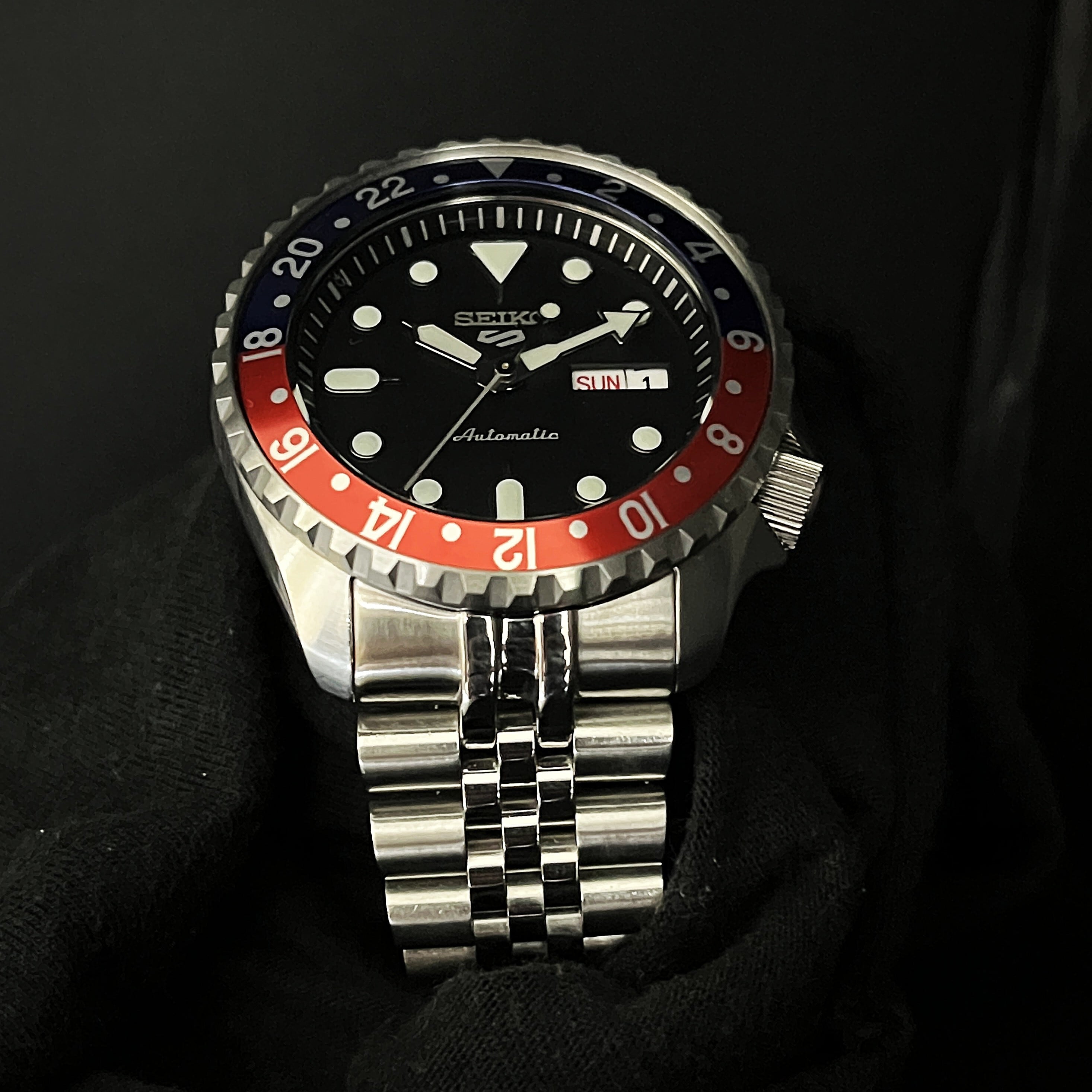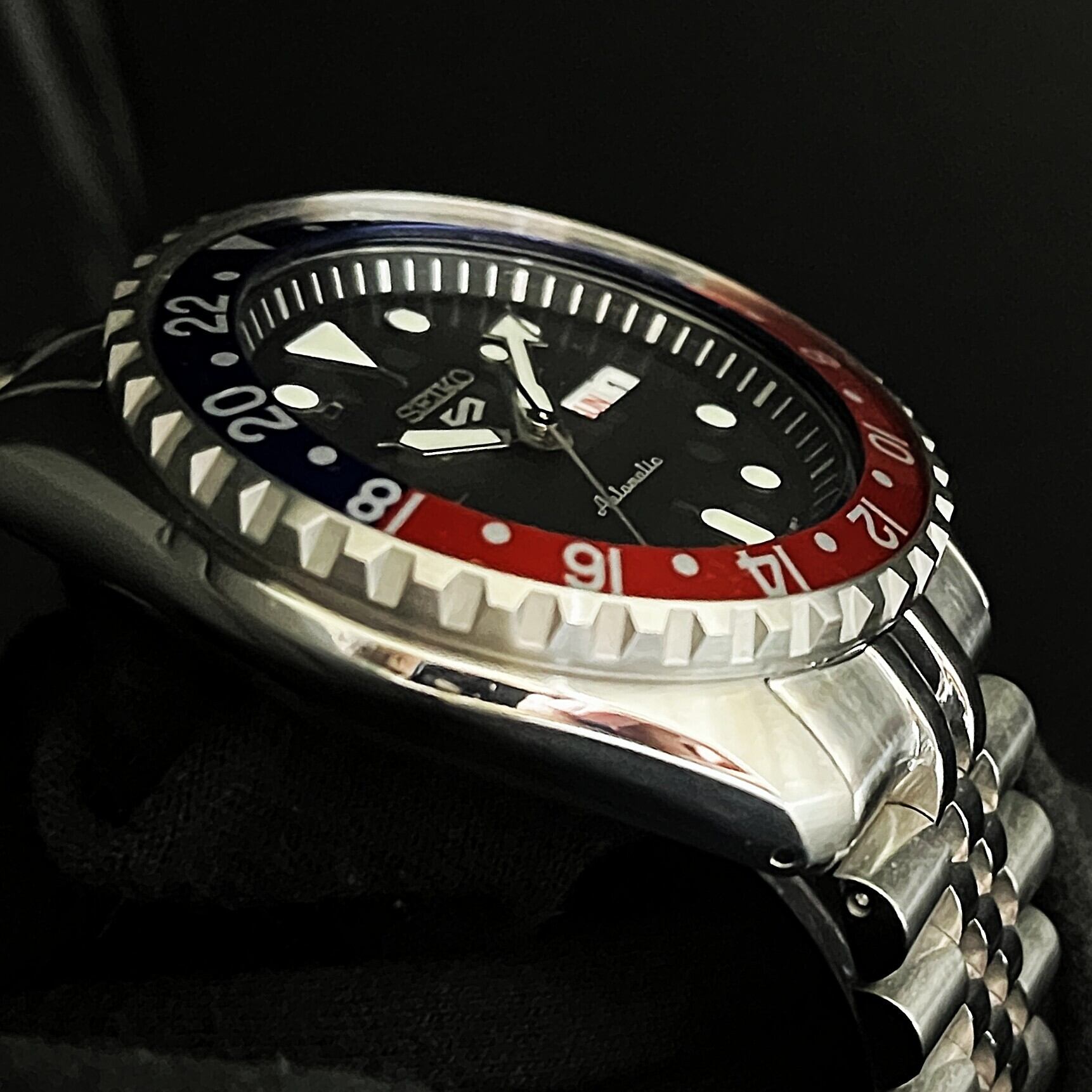 ご購入頂いたSEIKO5Sportsブラックフェイスに、LX lineタイプベゼルを装着し、OLD GMT24hタイプ(ペプシカラー)のベゼルインサートをセット、ハイエンドなジュビリーブレスをあわせたエレガントなイメージのカスタム企画です。