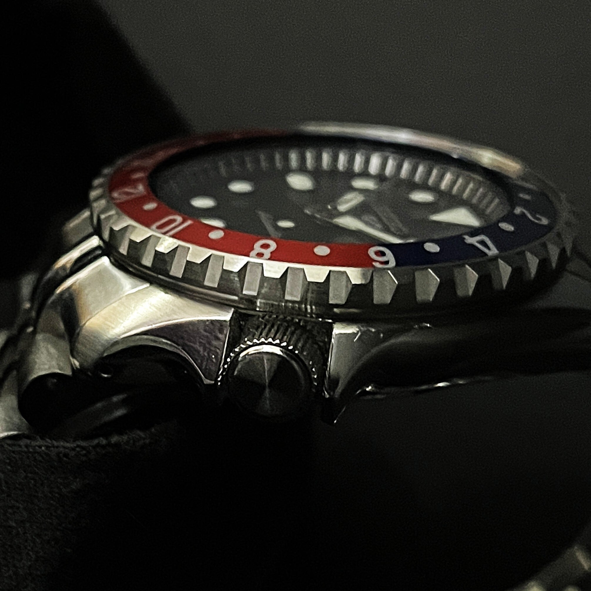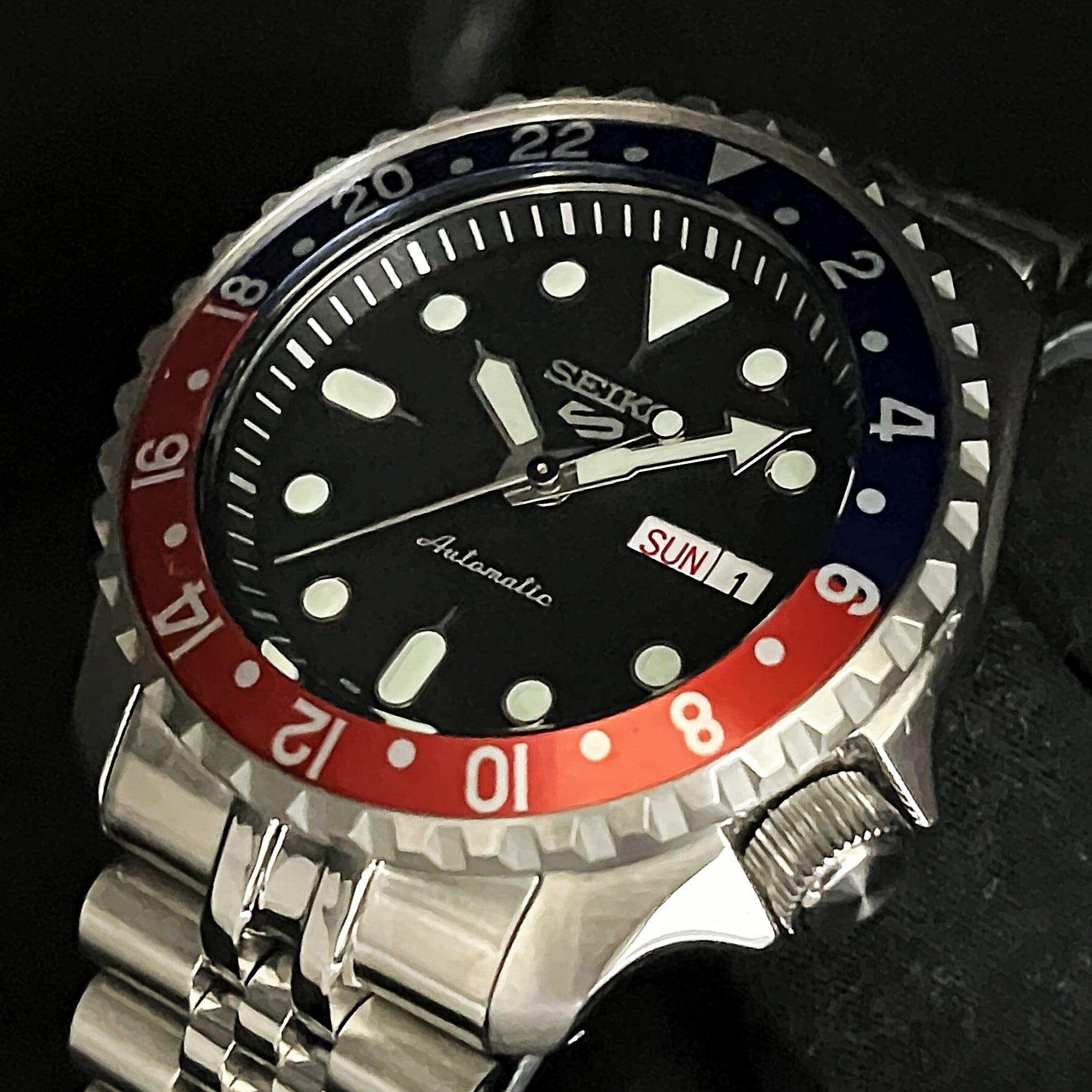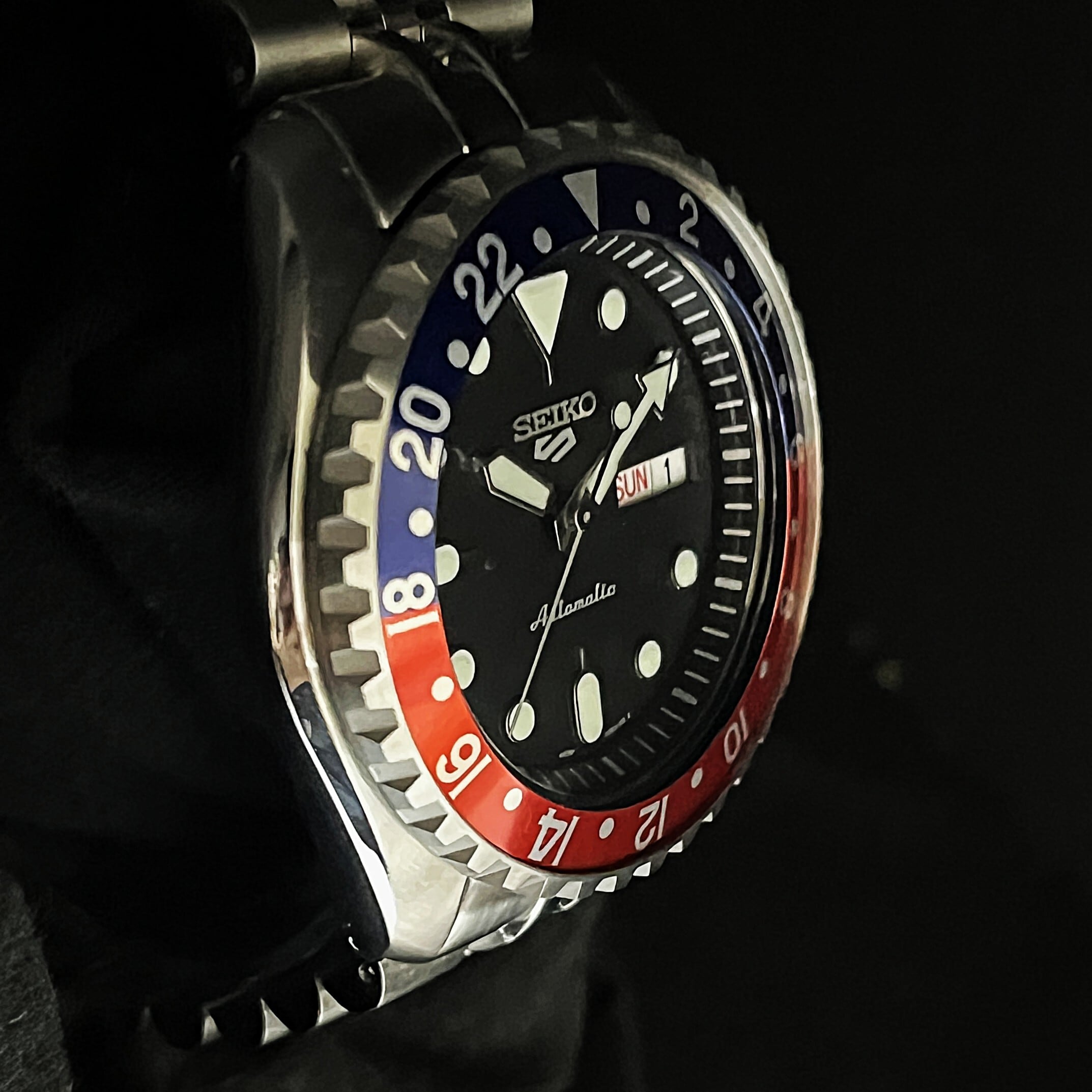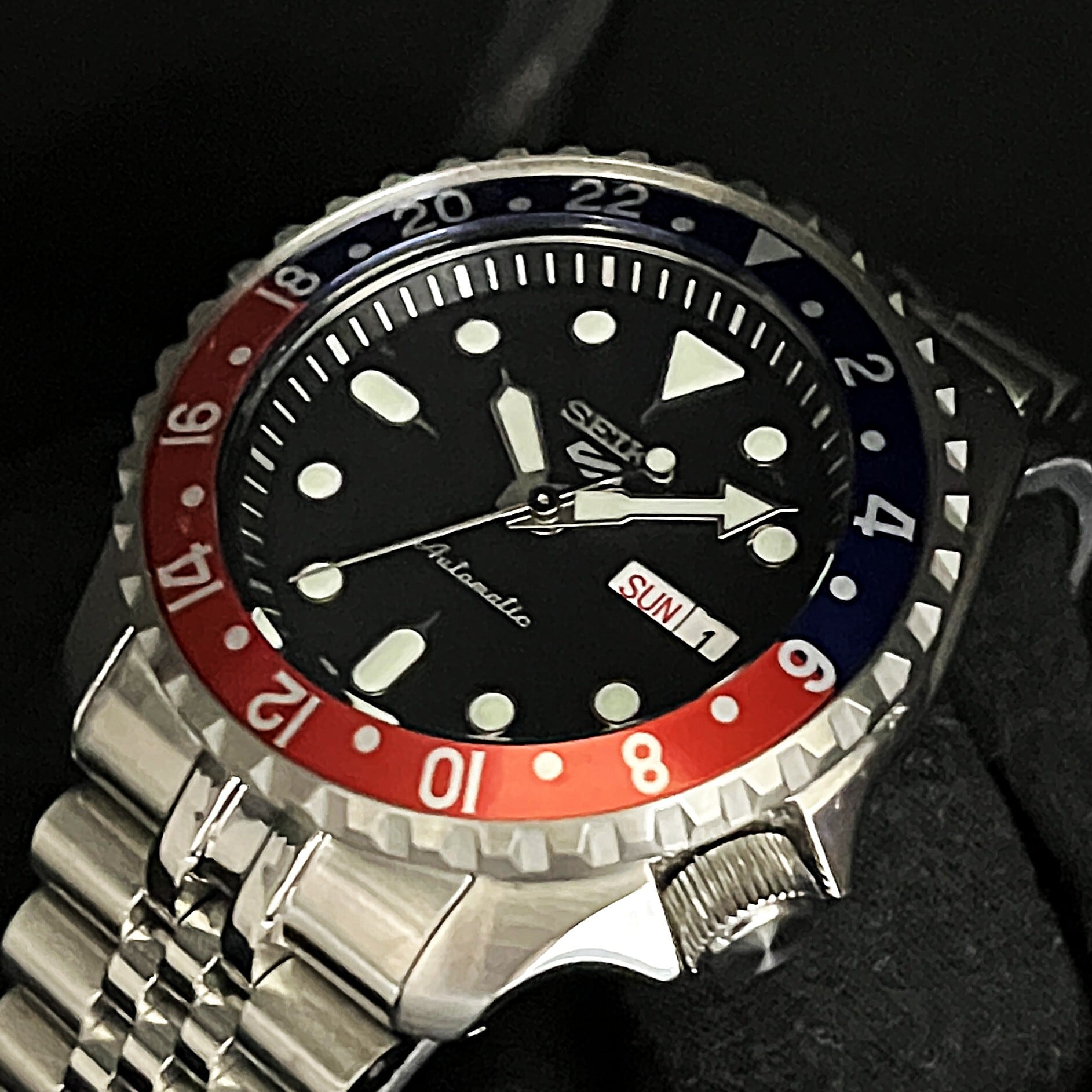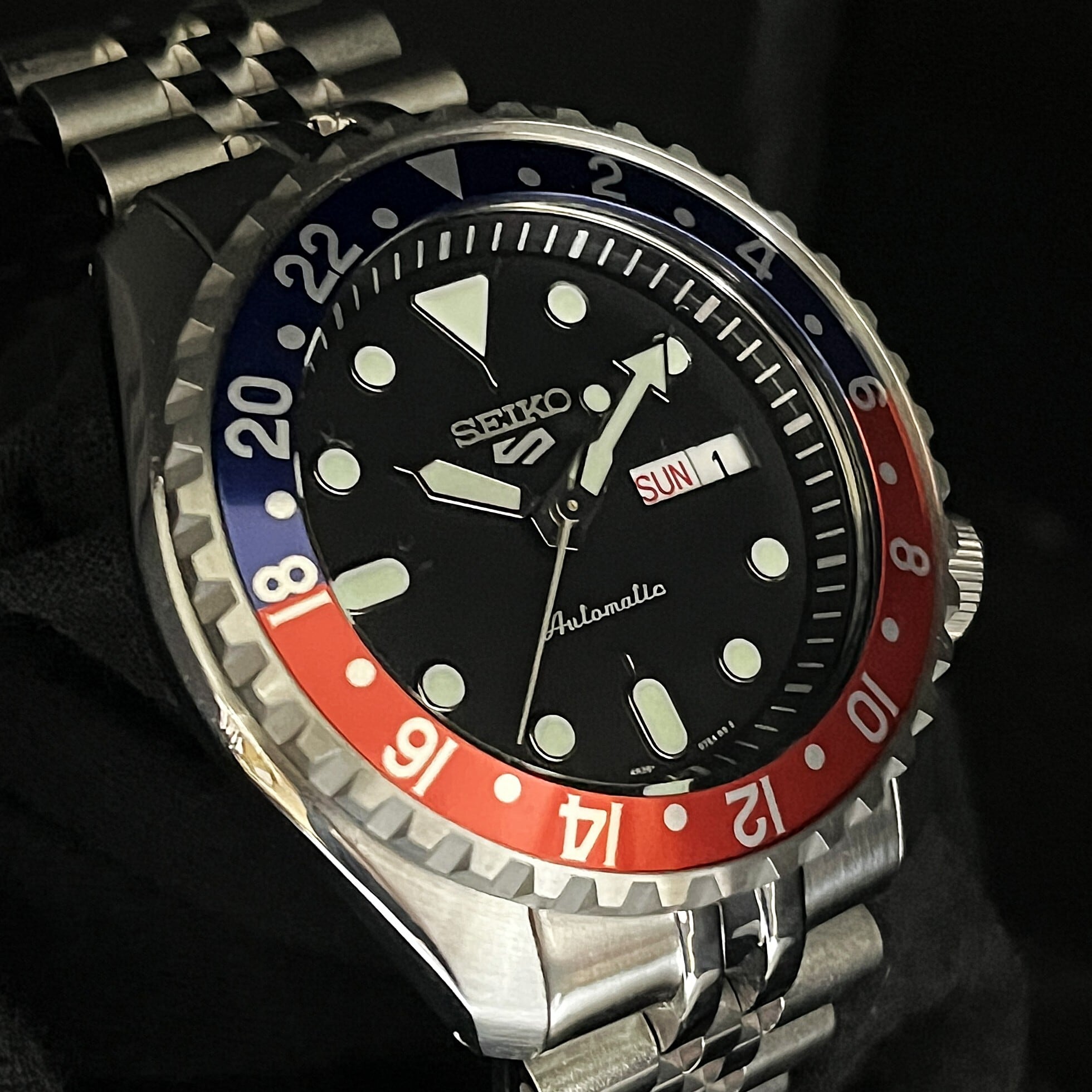 ご購入頂いたSEIKO5Sportsブラックフェイスに、LX lineタイプベゼルを装着し、OLD GMT24hタイプ(ペプシカラー)のベゼルインサートをセット、ハイエンドなジュビリーブレスをあわせたエレガントなイメージのカスタム企画です。