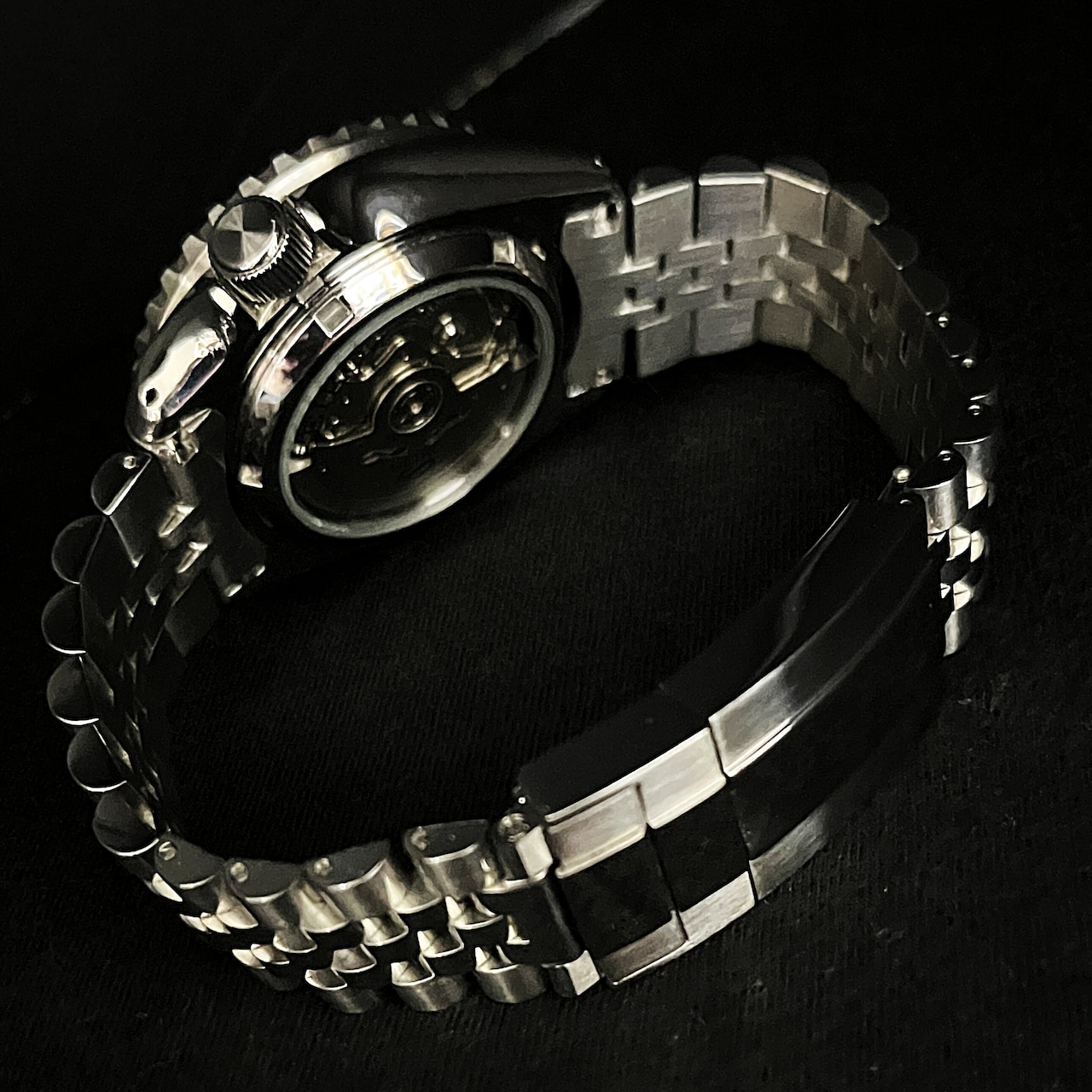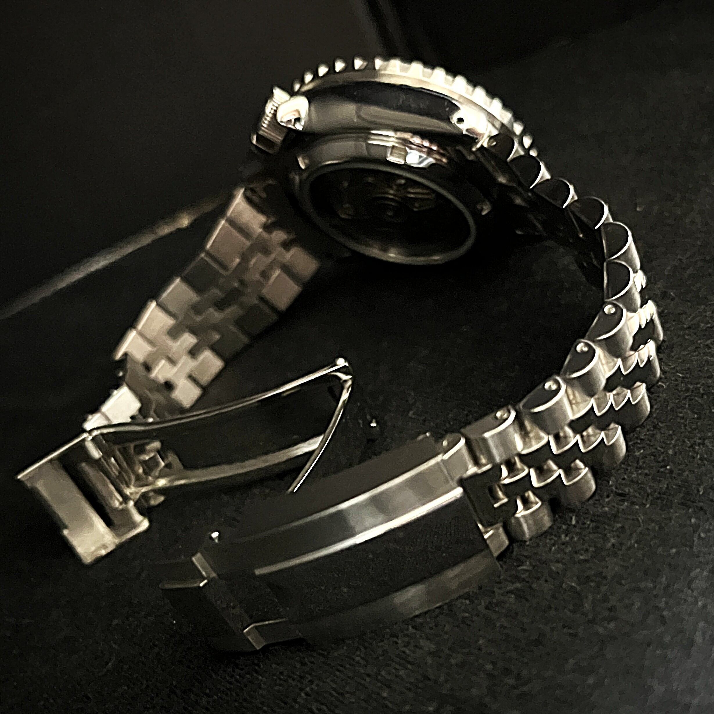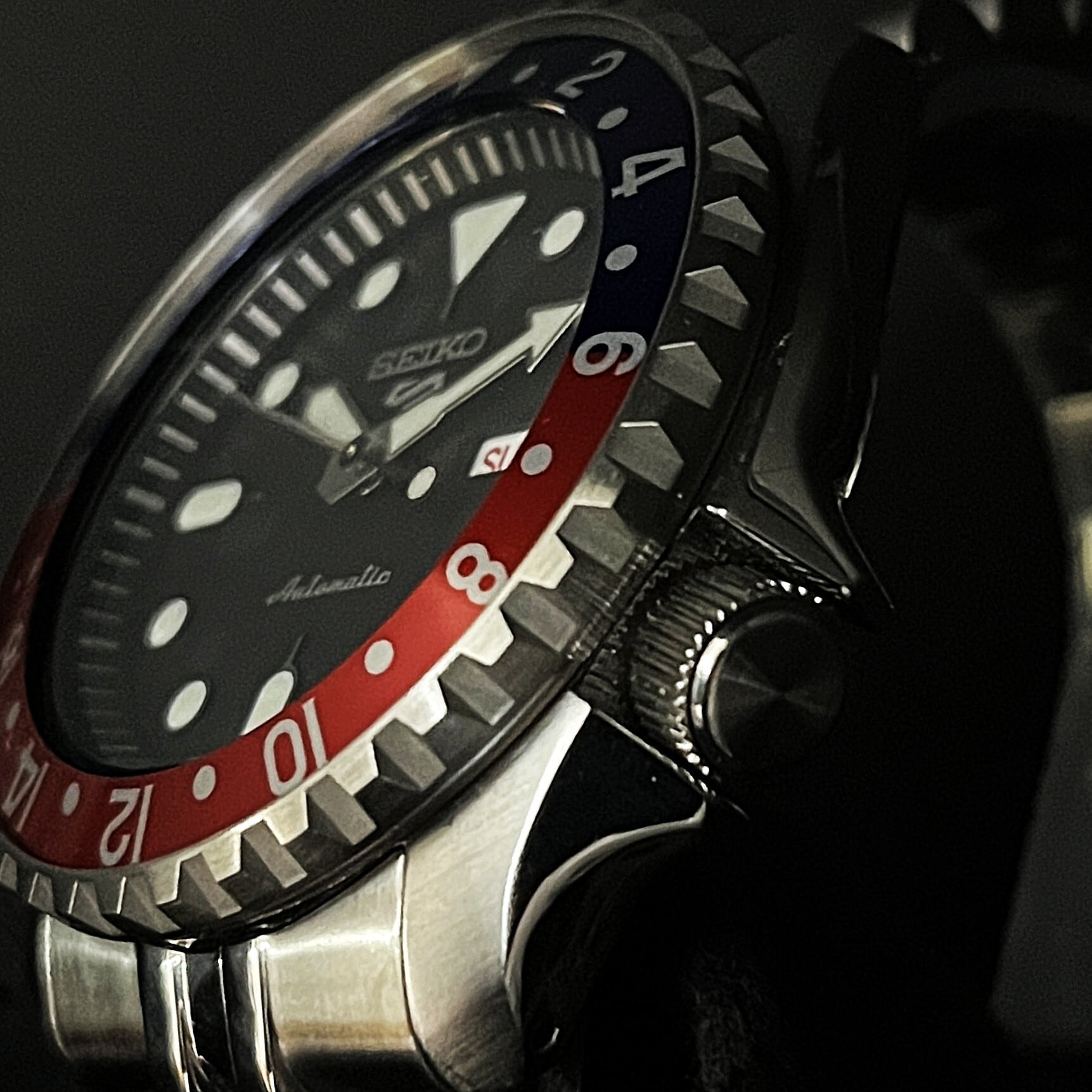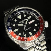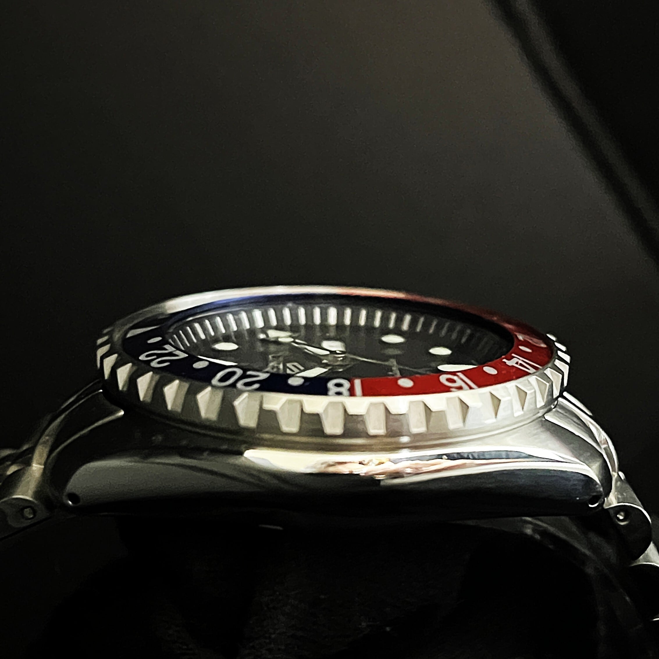 ご購入頂いたSEIKO5Sportsブラックフェイスに、LX lineタイプベゼルを装着し、OLD GMT24hタイプ(ペプシカラー)のベゼルインサートをセット、ハイエンドなジュビリーブレスをあわせたエレガントなイメージのカスタム企画です。