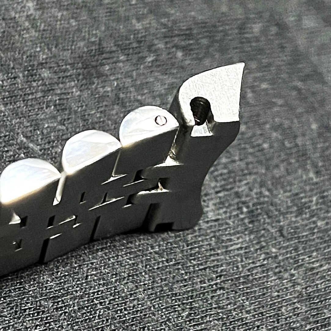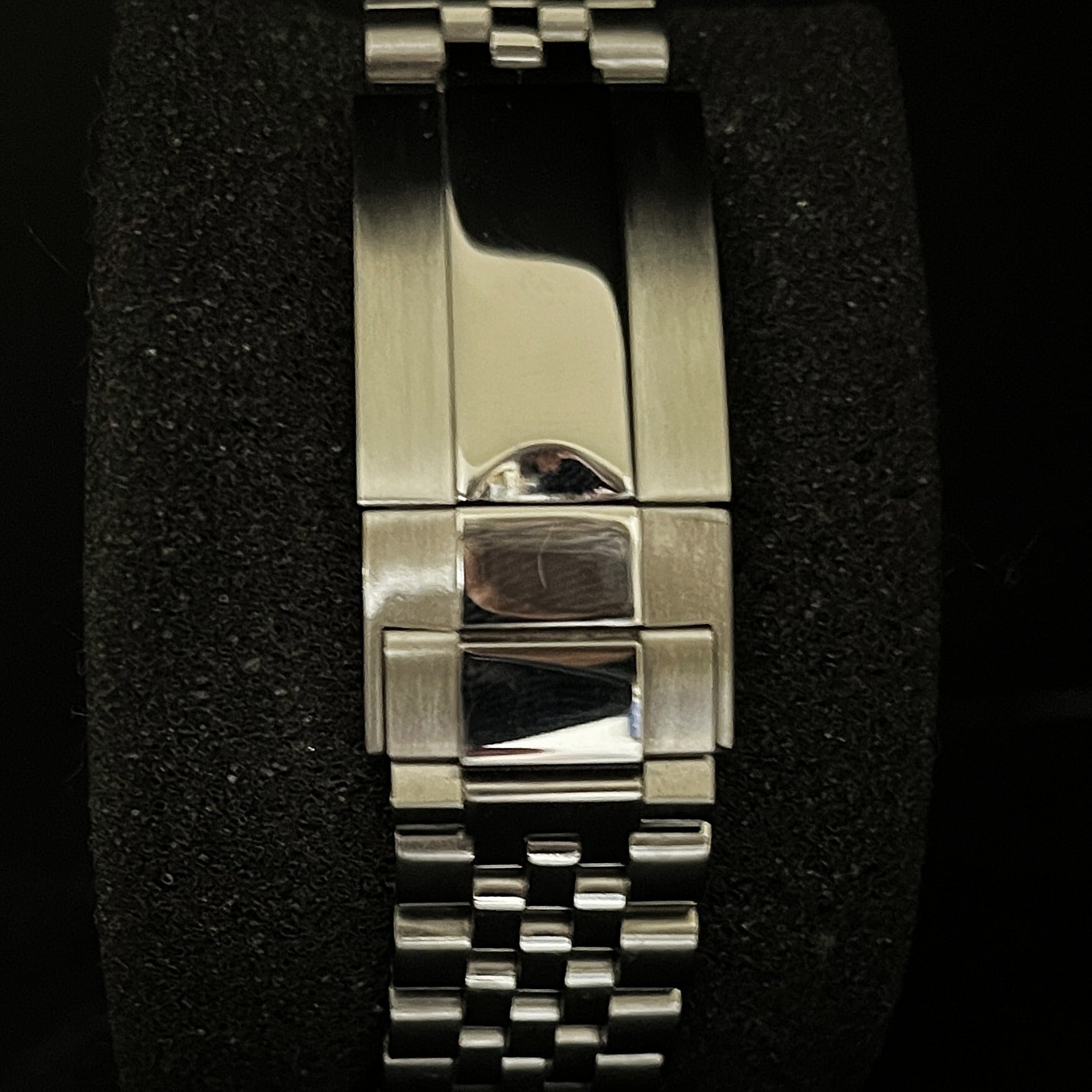 オーソドックスな5連のジュビリータイプのデザインですが、左右の外側はヘアライン仕上げ、中央から3連のピースは光輝処理がされています。