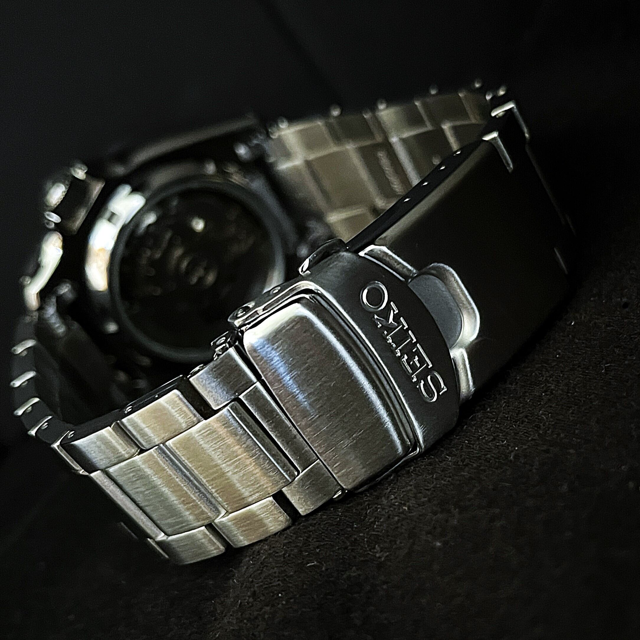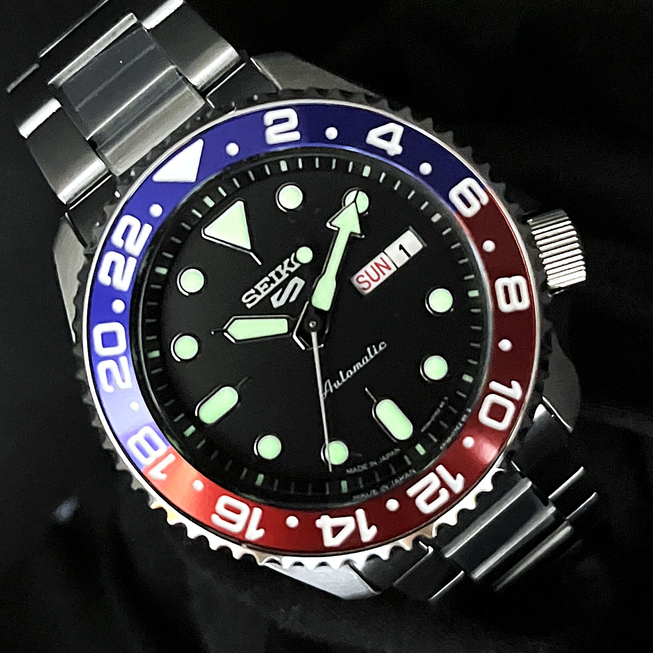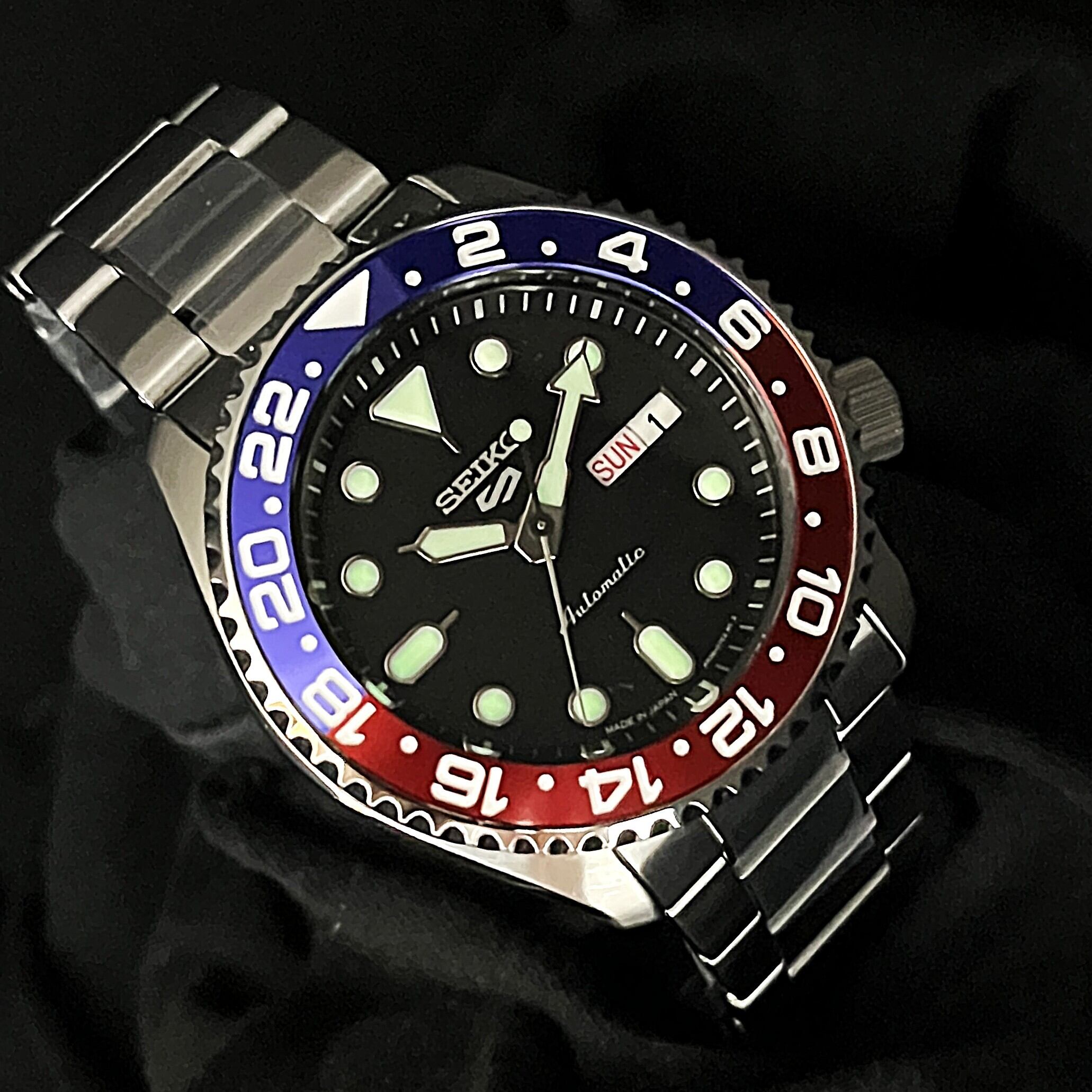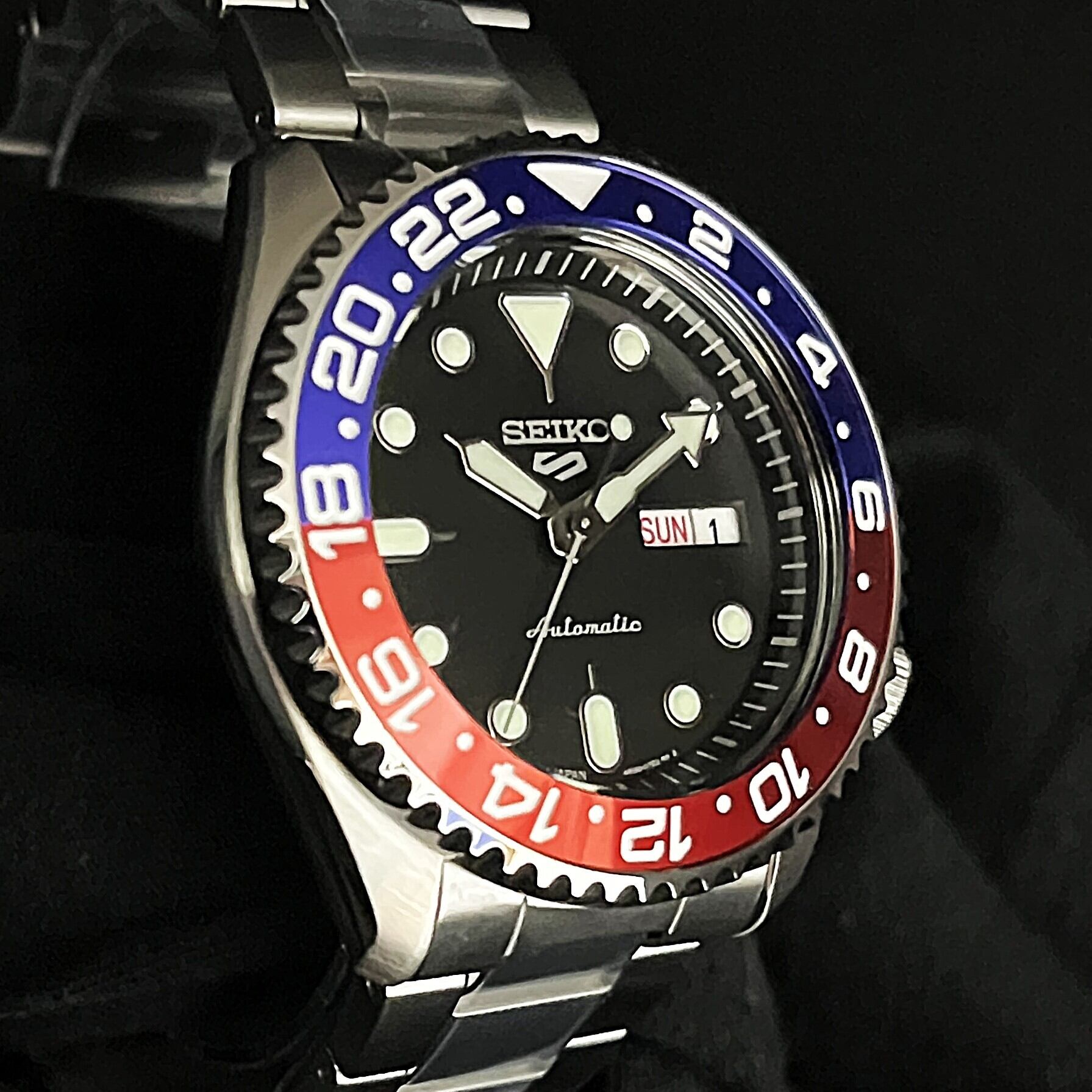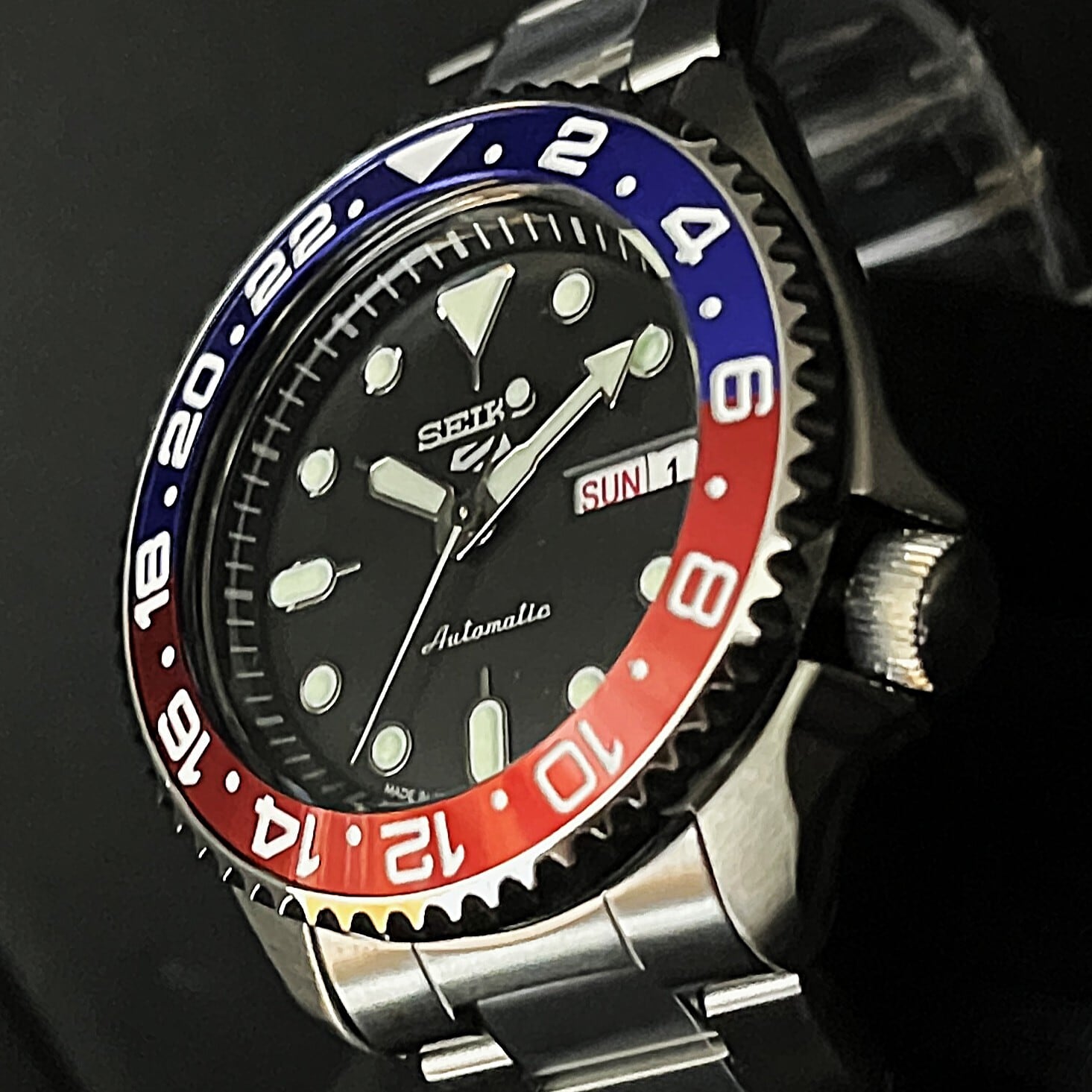 ご購入頂いたSEIKO5Sportsブラックフェイスに、ペプシカラーのGMT24hタイプのベゼルインサートをサブマリーナタイプのベゼルにセットして、純正のオイスタースタイルのステンレス製3連メタルバンドを組み込んだ、定番的なモディファイのご提案です。