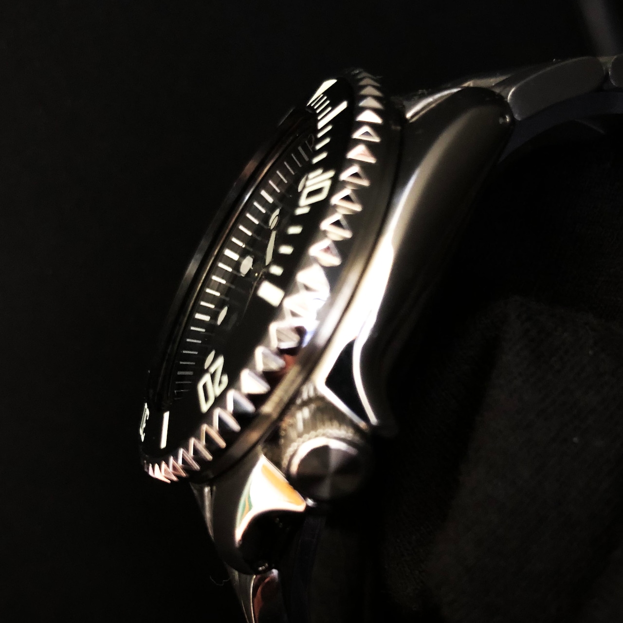 ご購入頂いたSEIKO5Sportsブラックフェイスにサブマリーナタイプのベゼルを組込み、同じくサブマリーナタイプのセラミックベゼルインサート(黒)LUMIに純正のステンレス3連のオイスターブレスを装着した、ベーシックな組み合わせです。