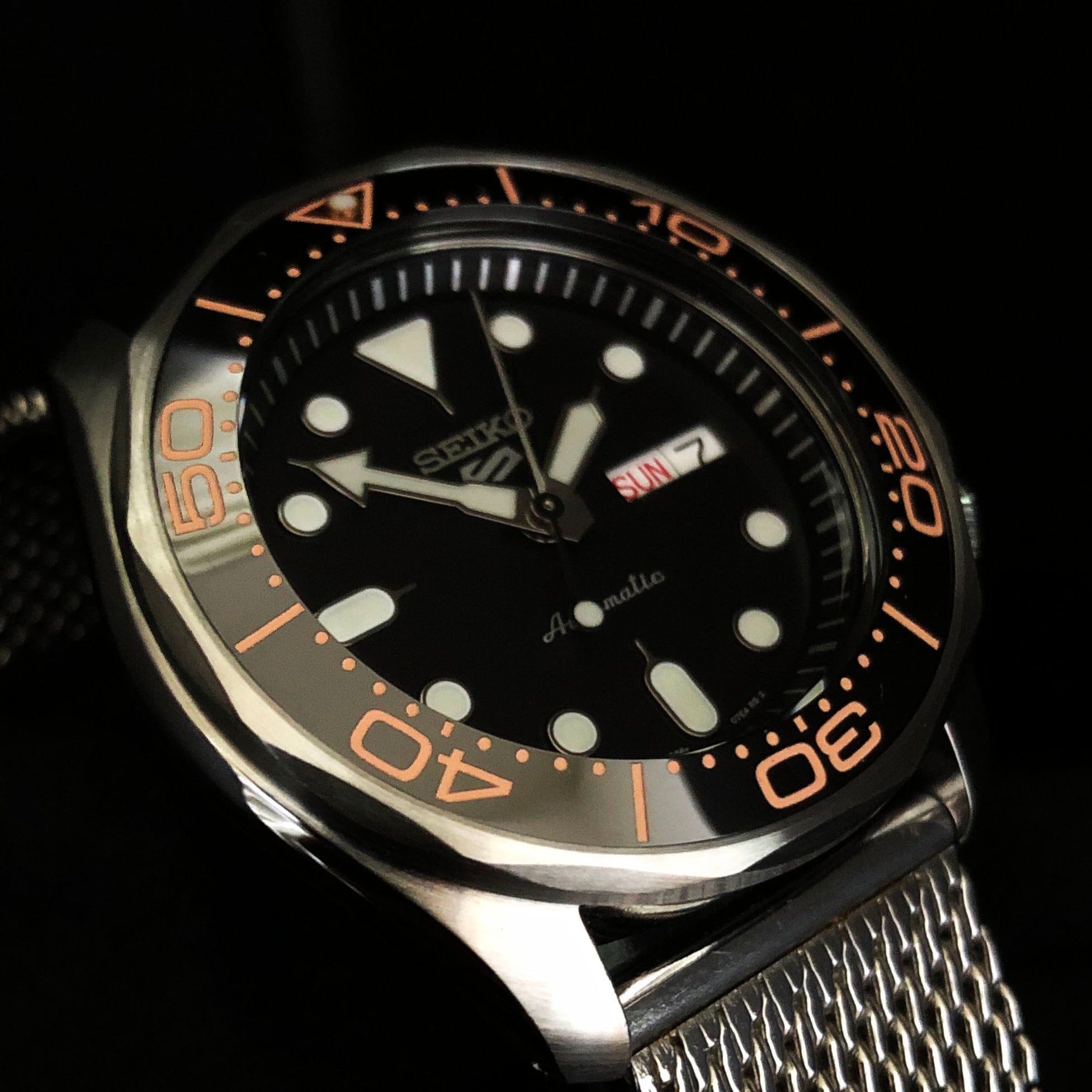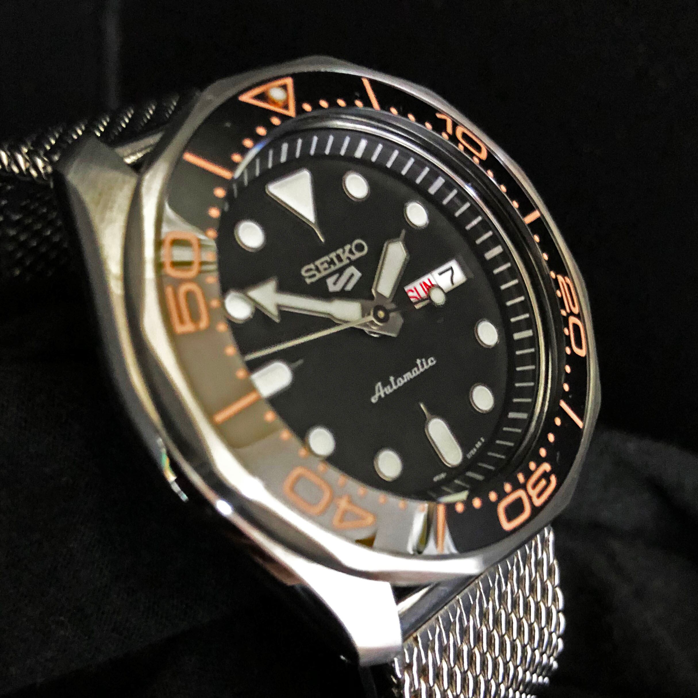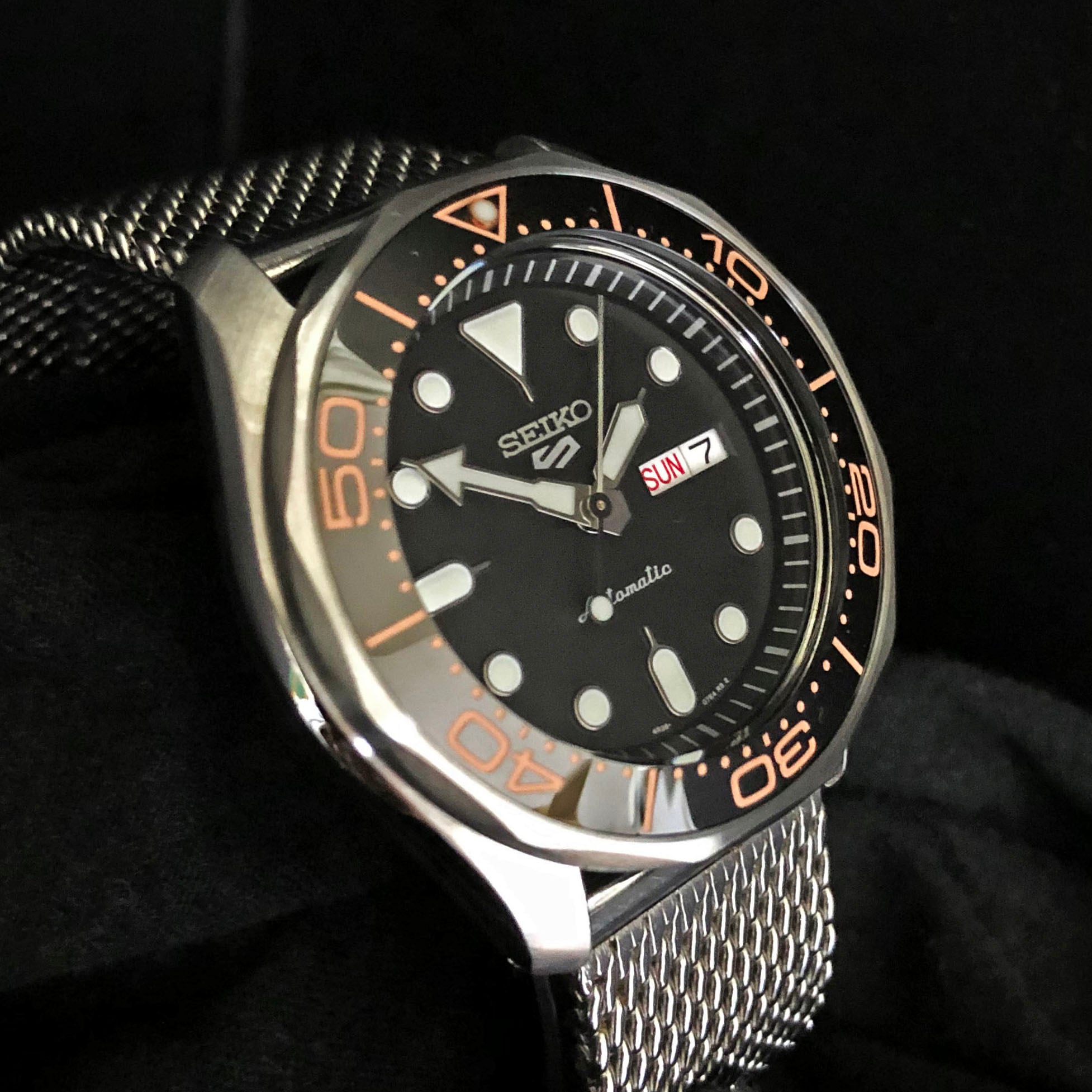 ご購入頂いたSEIKO5Sportsブラックフェイスに、OMGポリゴン(多角形)タイプのベゼルとSMP300Mタイプ(ブラック・ベージュ)のセラミックベゼルインサートをセットし、ステンレスメッシュバンド(厚口)を合わせた、ボンドウォッチからのスタディデザインをイメージしたモデファイリング企画です。