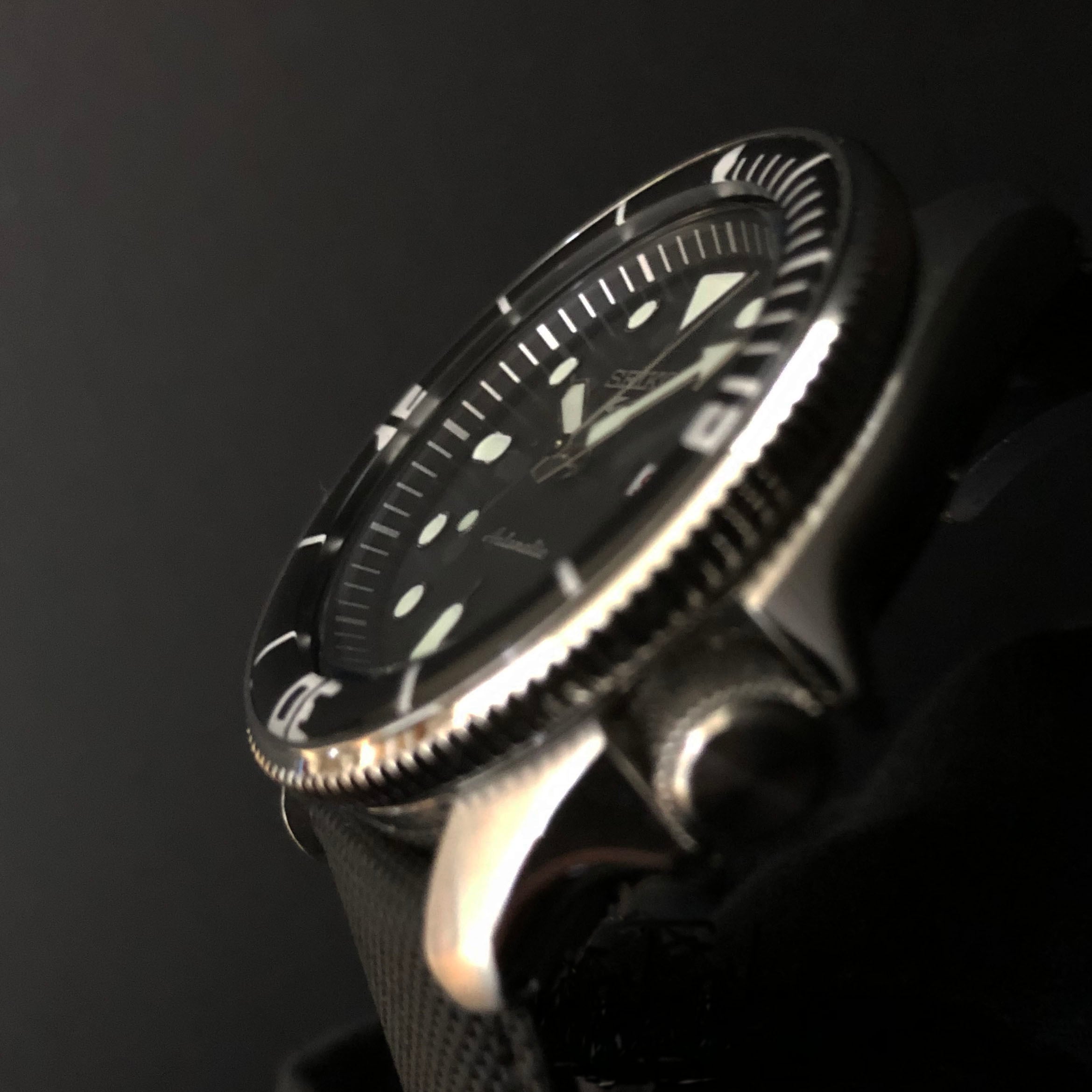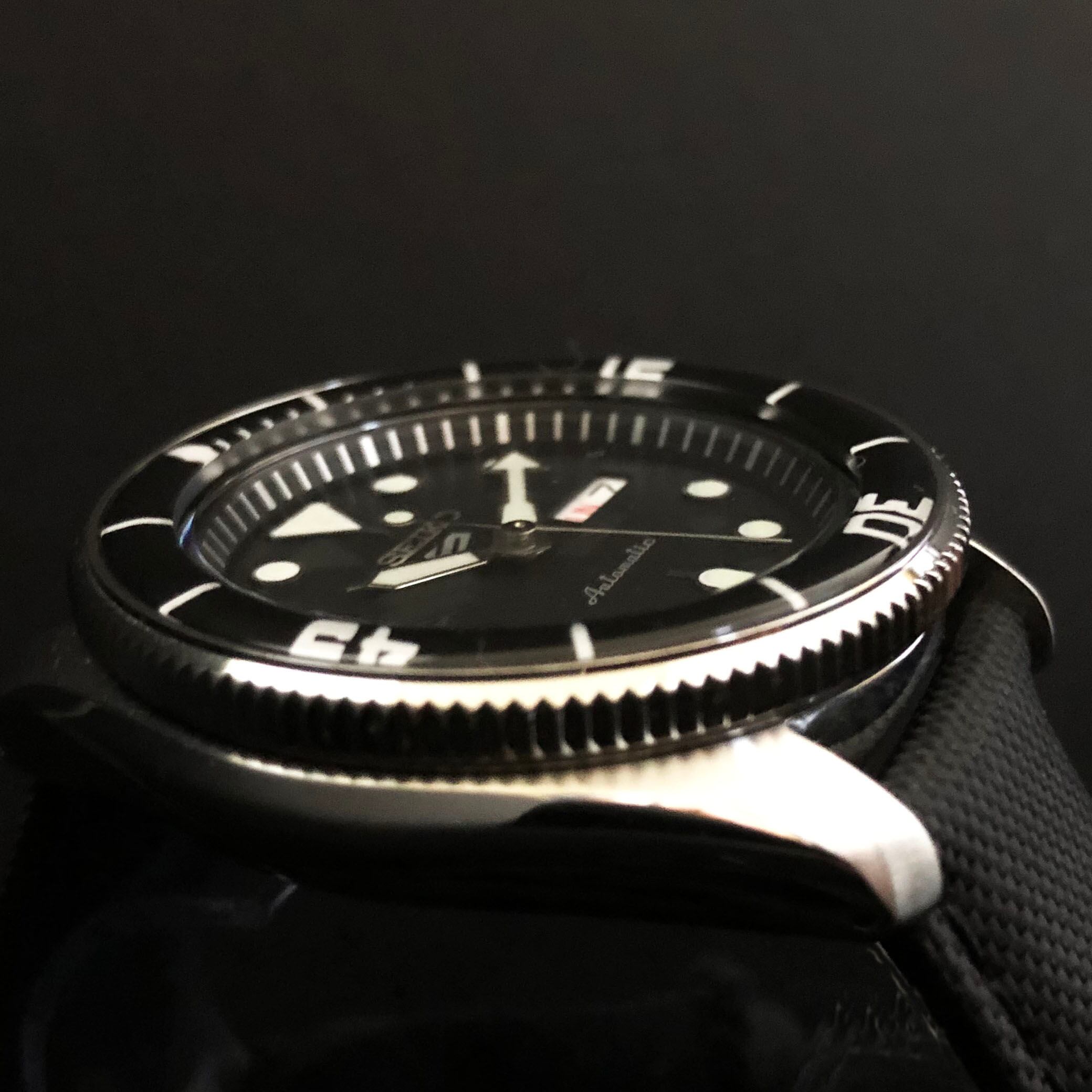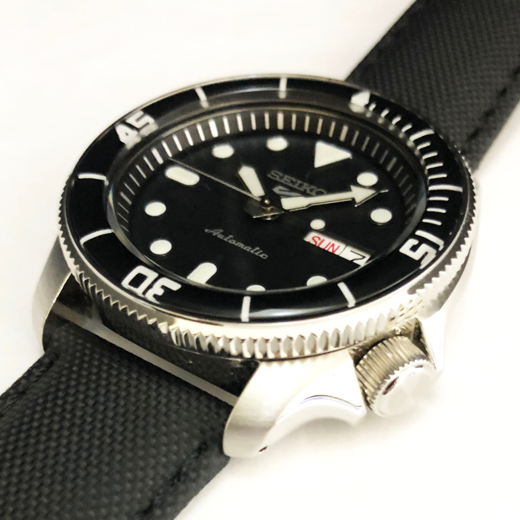 ご購入頂いたSEIKO5Sportsブラックフェイスに、繊細なコインエッジベゼルとBL FFタイプのガラスベゼルインサートをセットし、ハイデンシティキャンバス&本革ベルトをセットしたフィフティファゾズムをリスペクトした組み合わせです。