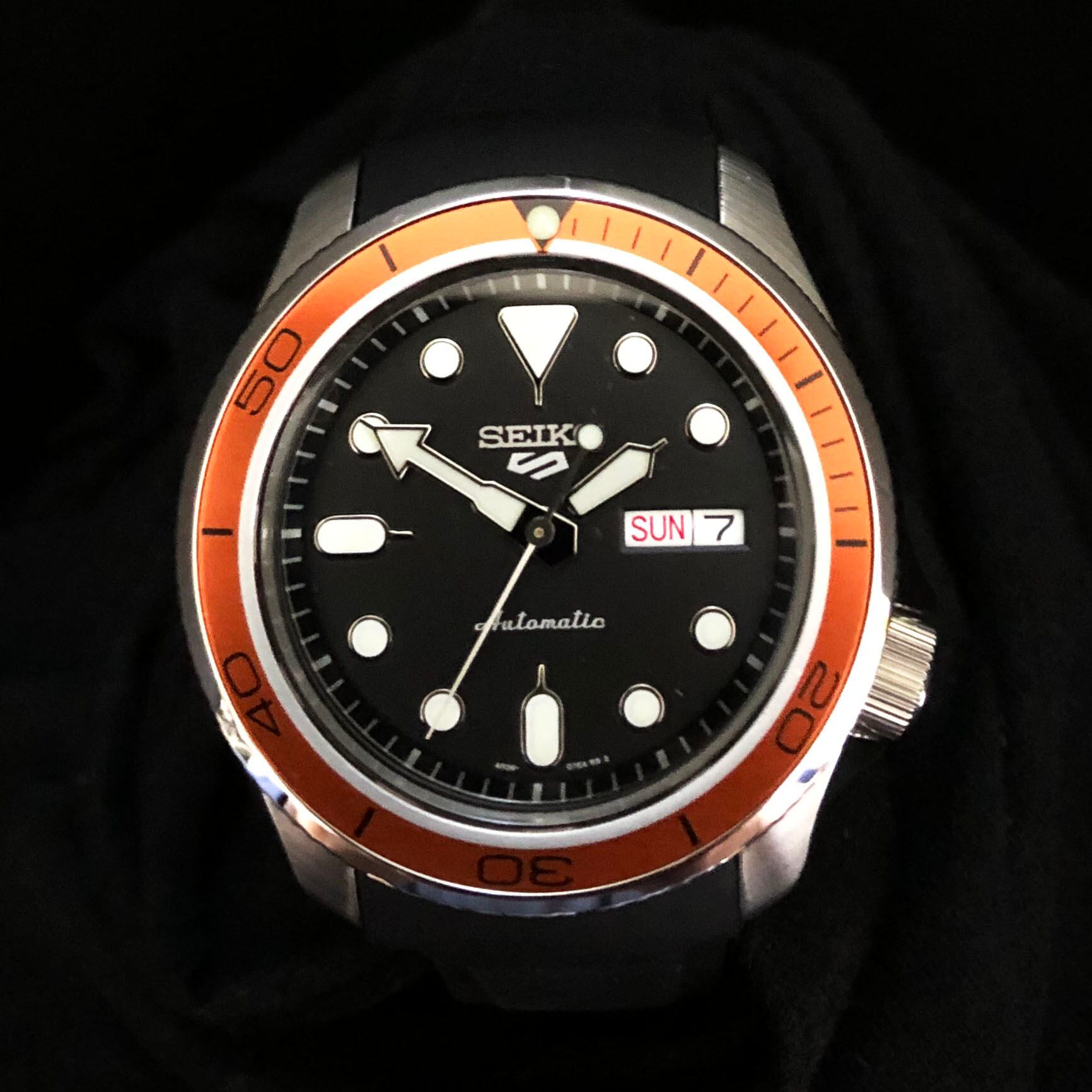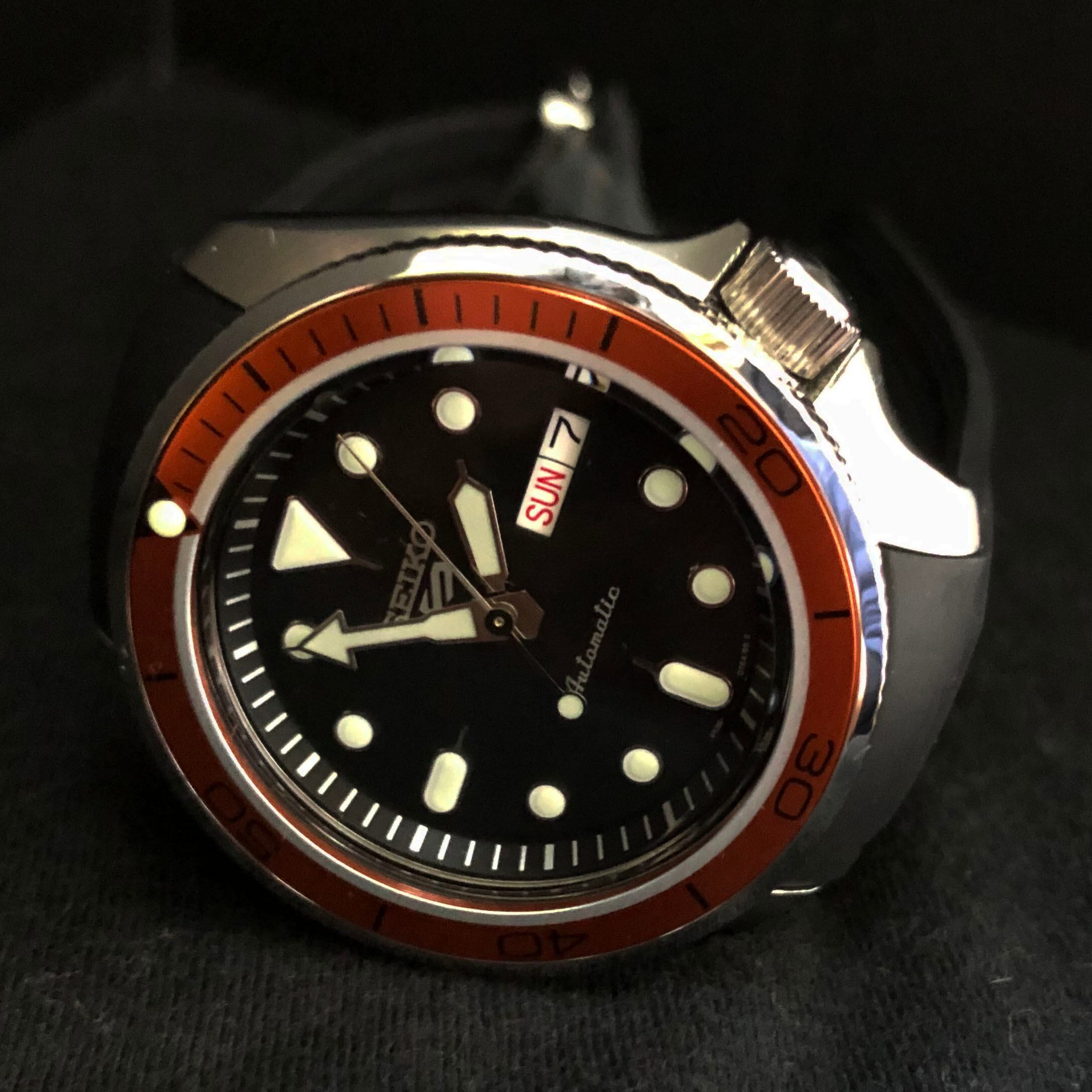 ご購入頂いたSEIKO5Sportsブラックフェイスにダイヤローレットベゼル(シルバー)とプラネットオーシャンタイプ(オレンジ)のフラットベゼルインサートをセットし、シリコンラバーバンド(ブラック)を合わせた、アクティブな印象のモデルです。