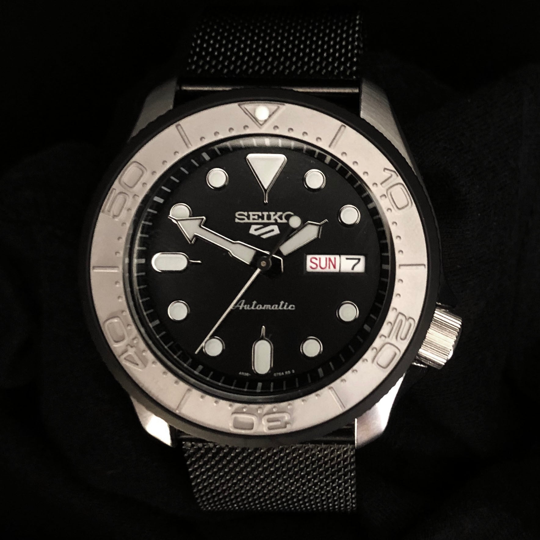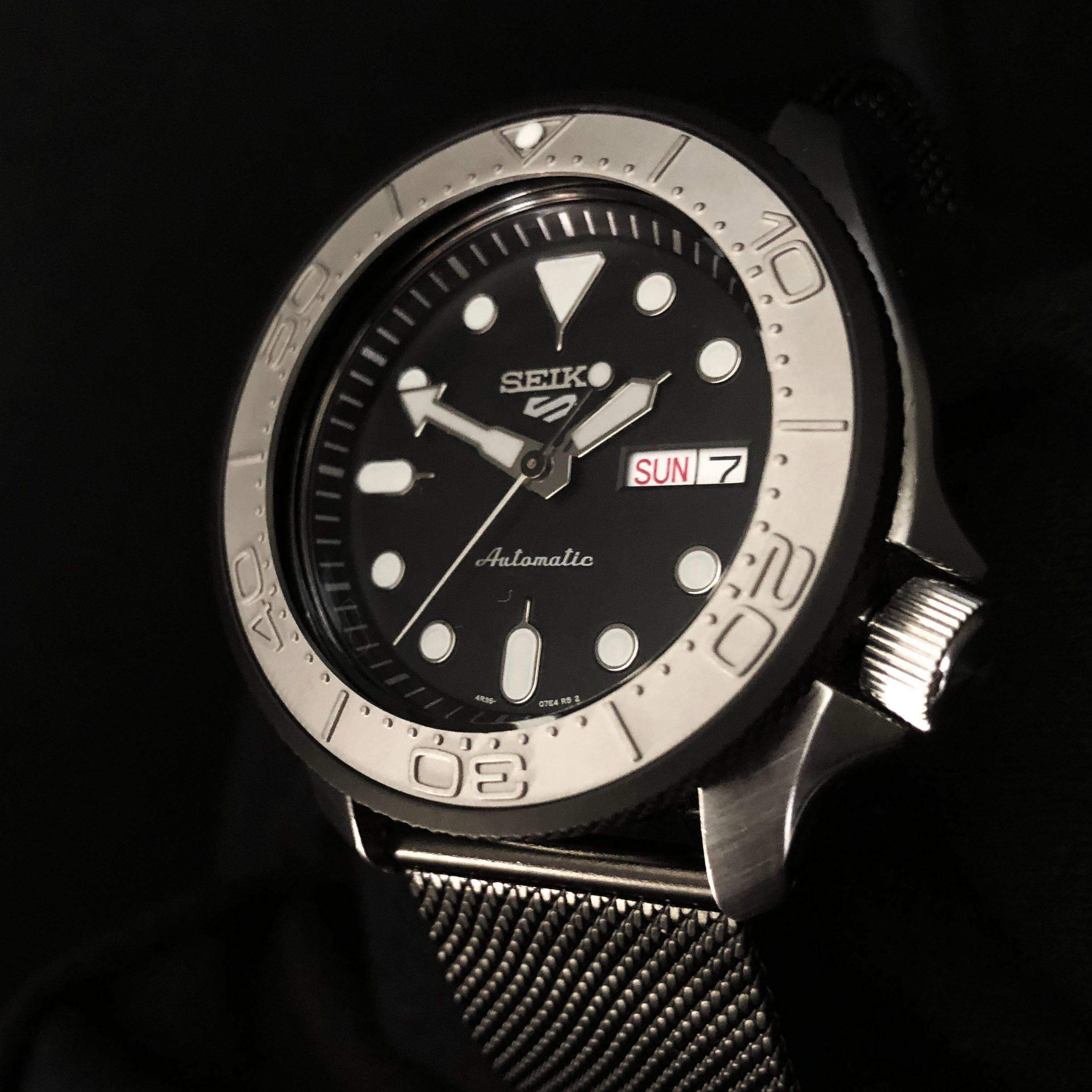 ご購入頂いたSEIKO5Sportsブラックフェイスに、ダイヤローレットベゼル(マットブラック)とSMP300Mタイプ(エンボスシルバーグレー)のセラミックベゼルインサートをセットし、ブラックのステンレスメッシュバンドを合わせた重厚なイメージのカスタム企画です。