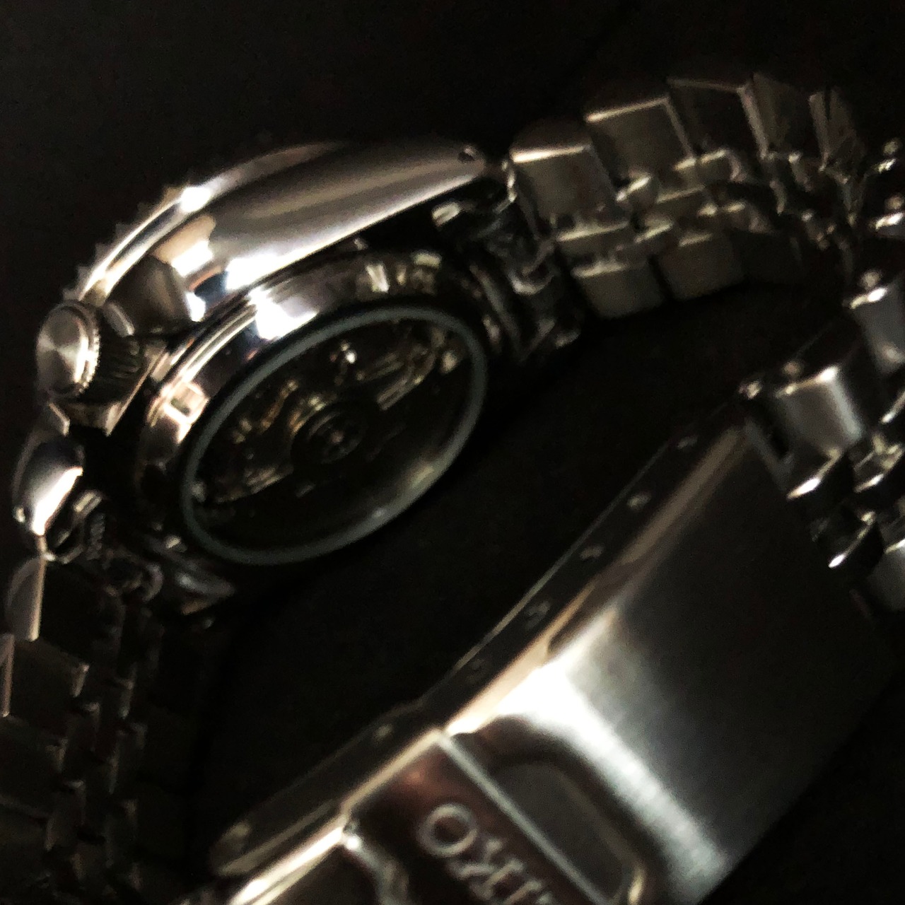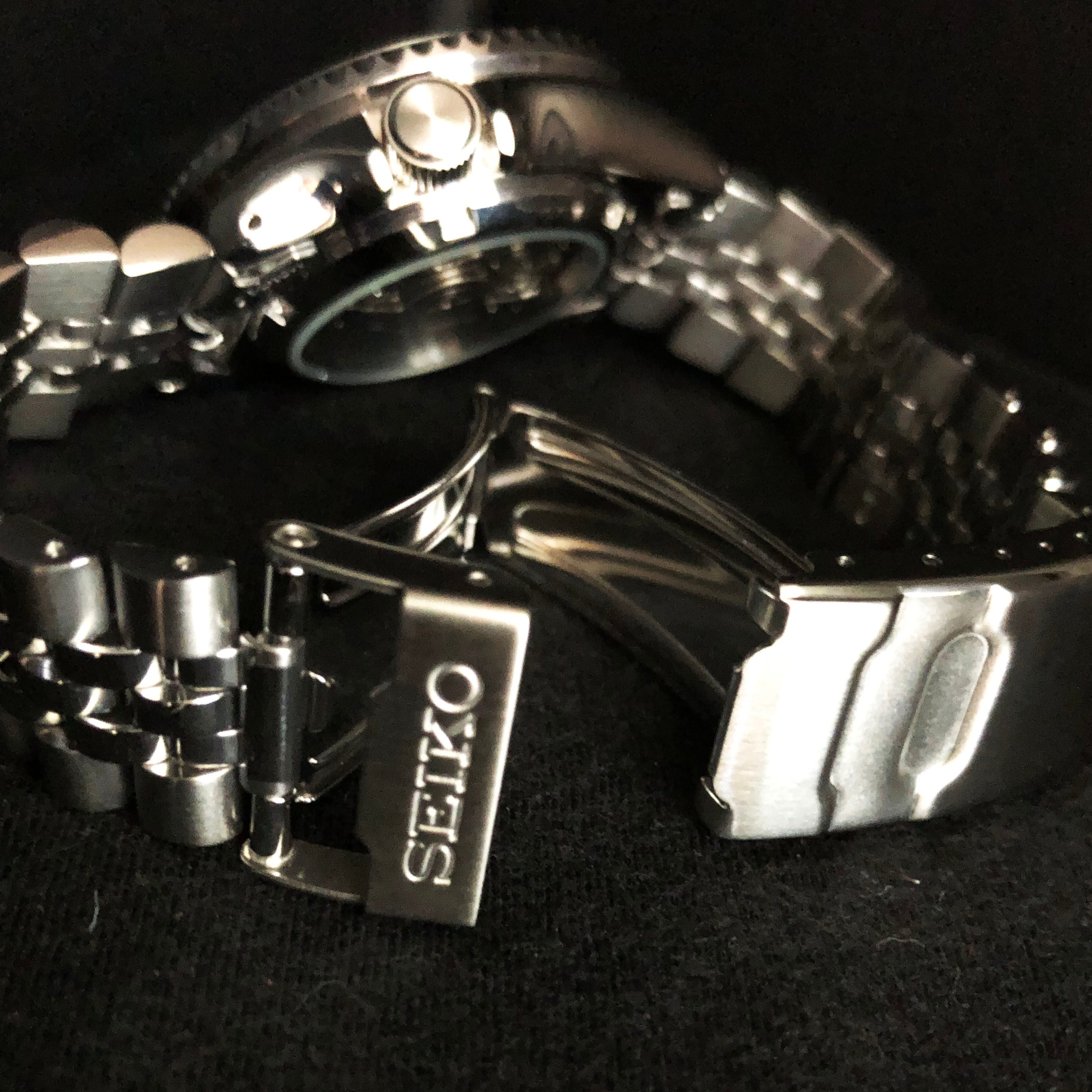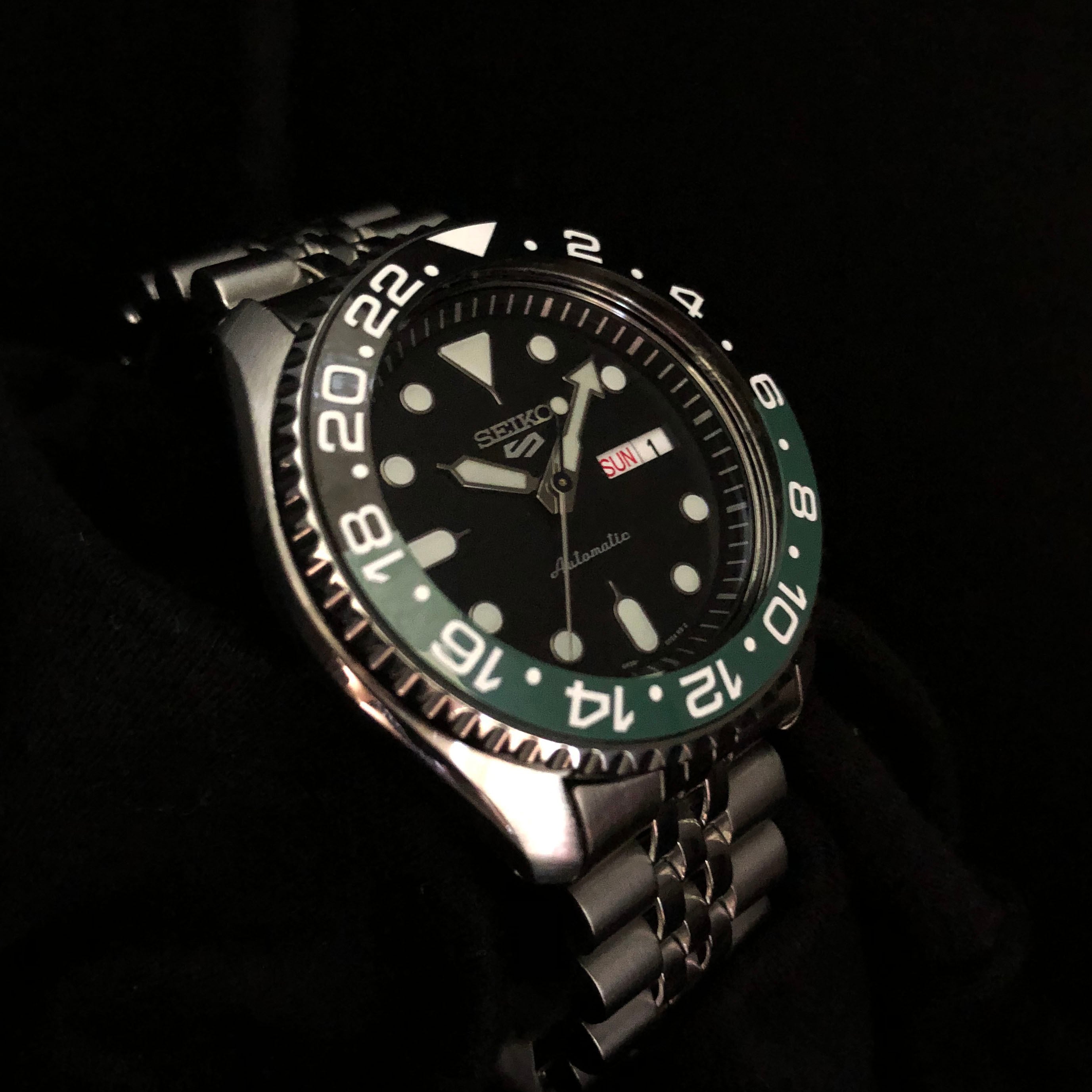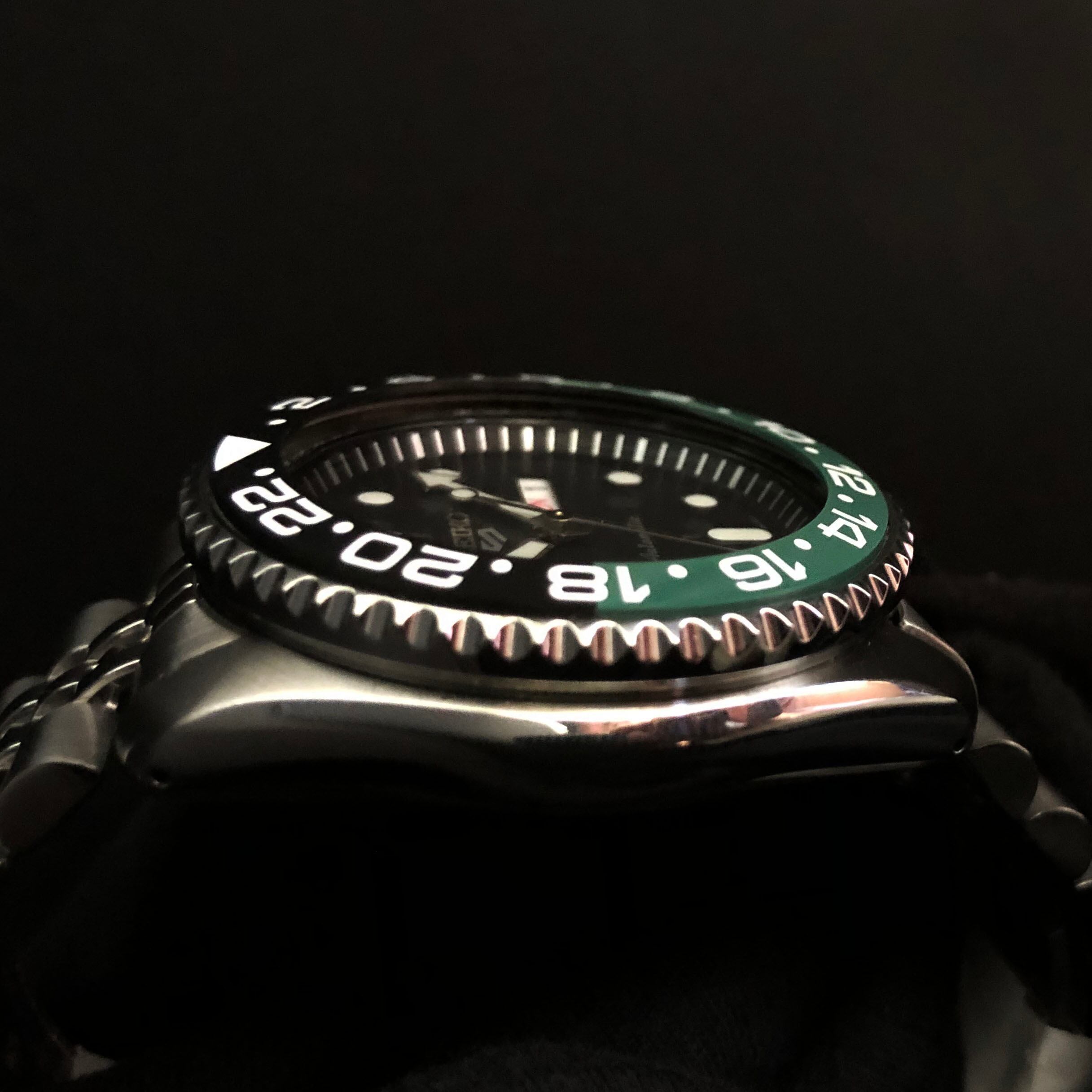 ご購入頂いたSEIKO5Sportsブラックフェイスに、サブマリーナタイプベゼルとGMT24hタイプセラミックベゼルインサート(ブラック・グリーン)をセットし、SEIKO純正ジュビリーブレス 44G1JZ を合わせた品格溢れるmod内容です。