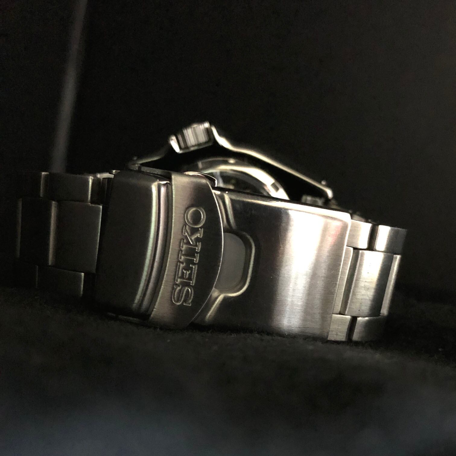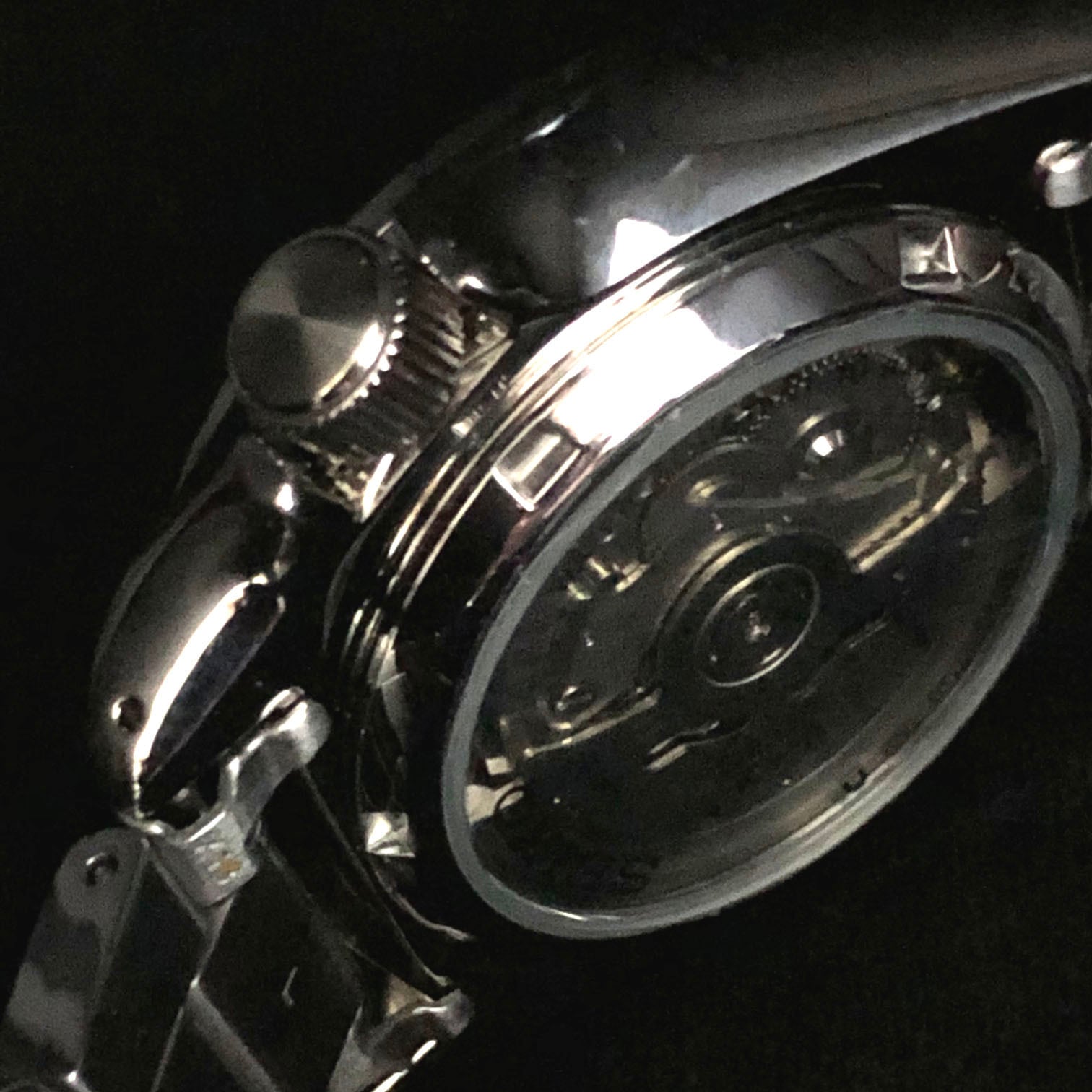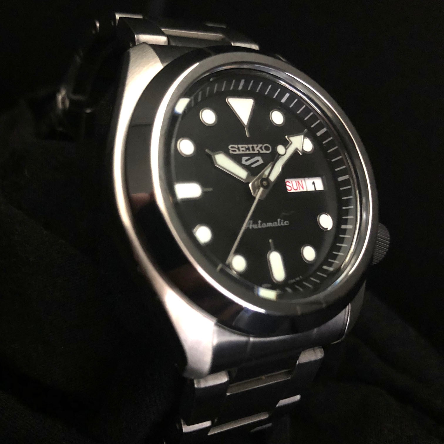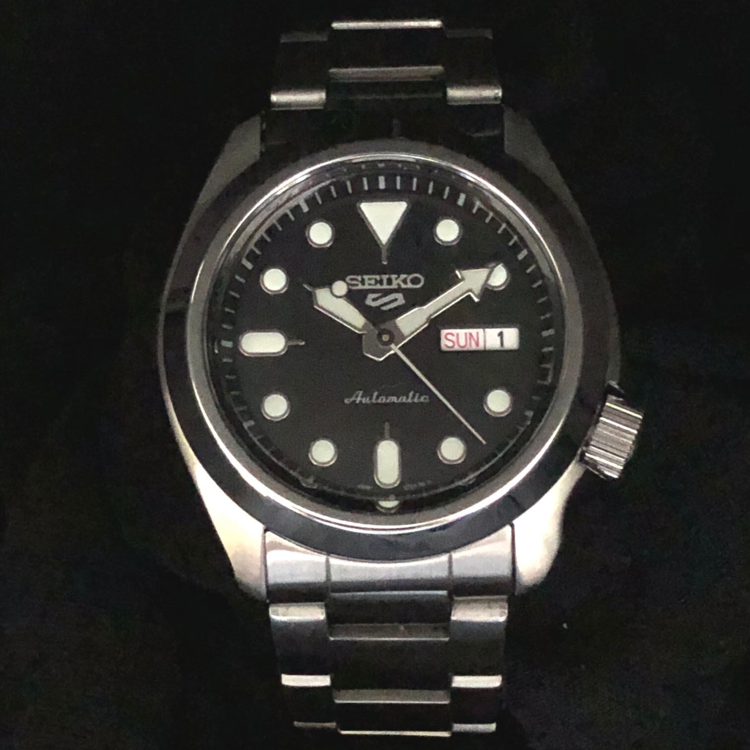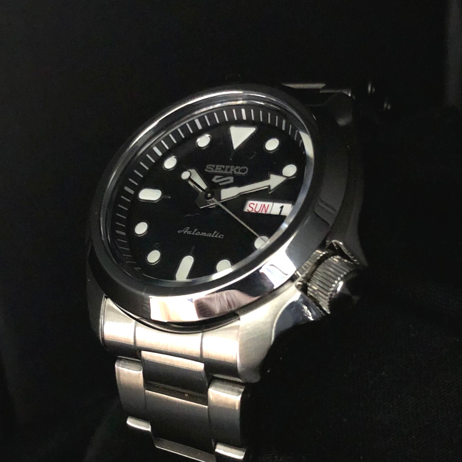 ご購入頂いたSEIKO5Sportsブラックフェイスに、スムーズタイプベゼル(シルバーポリッシュ)とSEIKO純正オイスタータイプのステンレスブレスレットを合わせたシンプルな組み合わせのモデファイリングです。