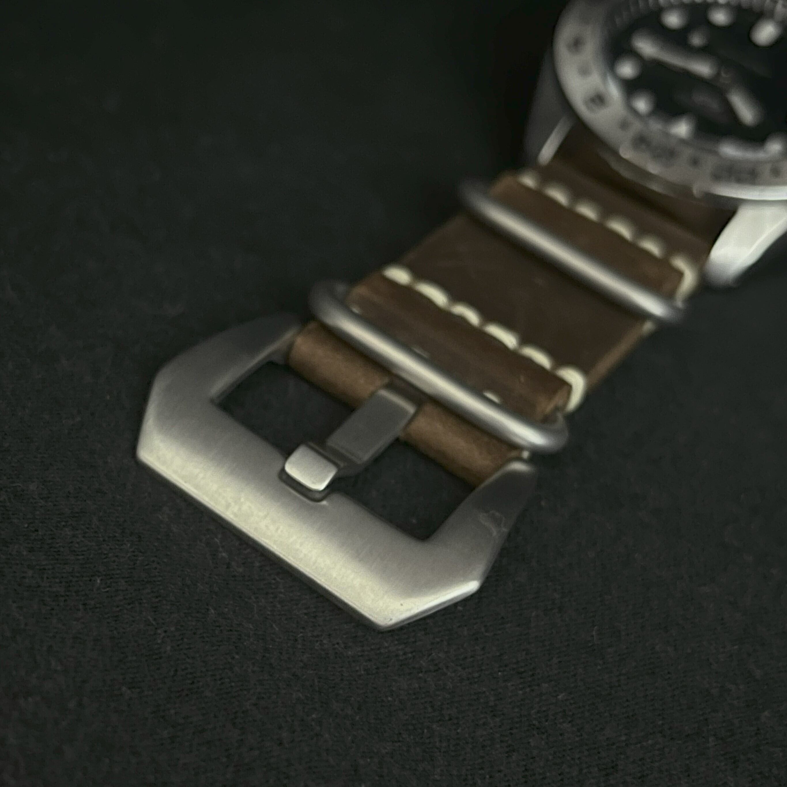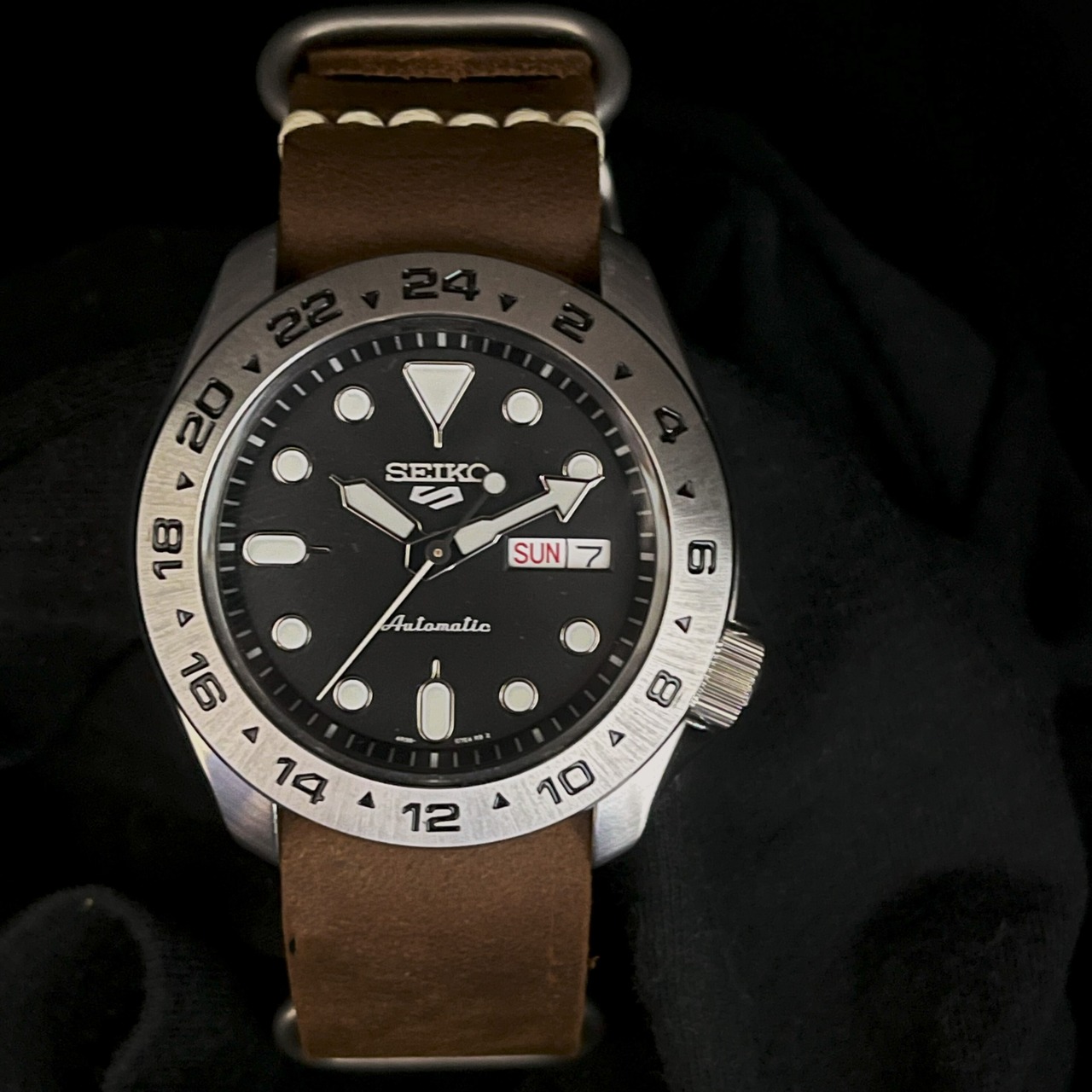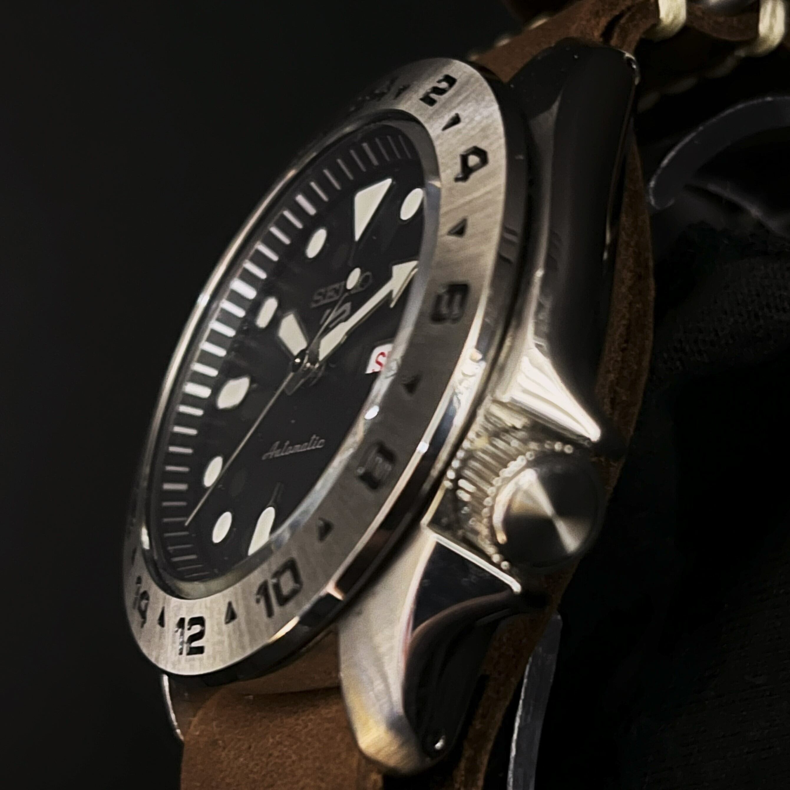 ご購入頂いたSEIKO5Sportsブラックフェイスに、ExpⅡSLIMタイプベゼル(シルバー)を組込み、本革製NATOストラップ(ダークブラウン)を合わせたクラシックダイバー調なモデファイリング企画です。