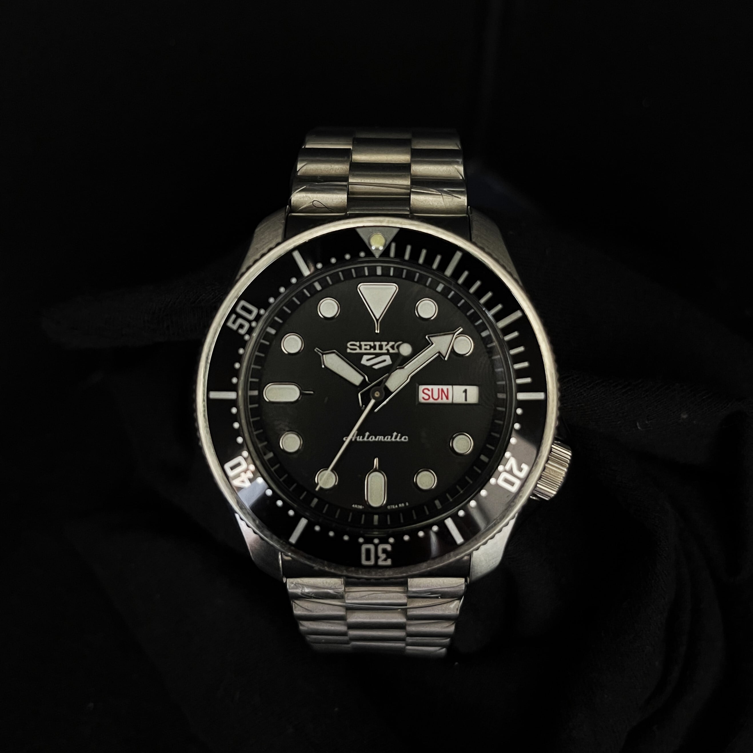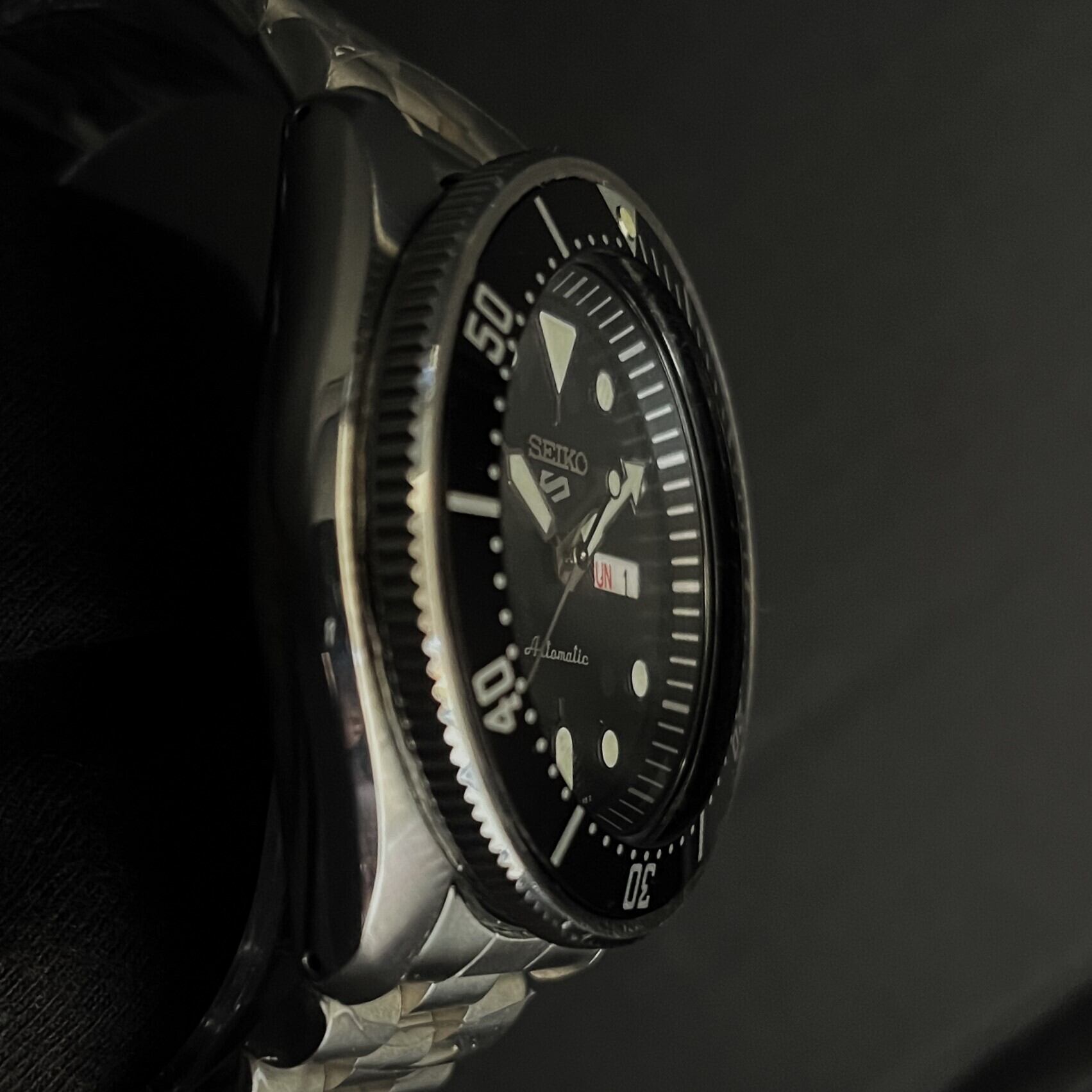 ご購入頂いたSEIKO5Sportsブラックフェイスに、コインエッジベゼル、SMPタイプ(ブラック)のベゼルインサートをセットし、ステンレス製のプレジデントタイプのブレスレットを合わせた、オーソドックススタイルのmod企画です。