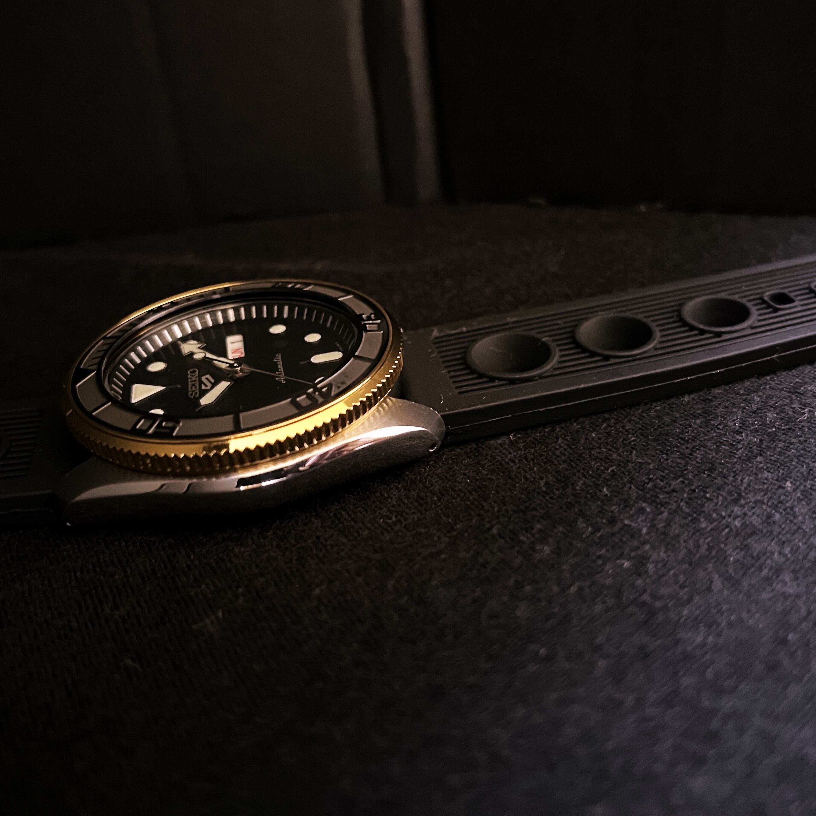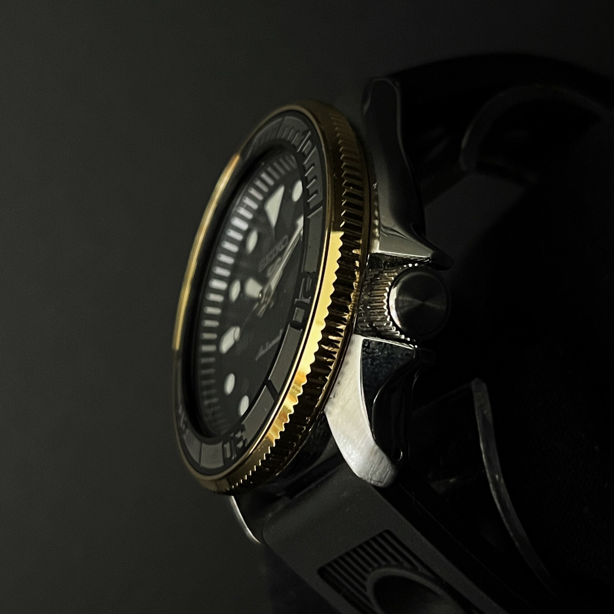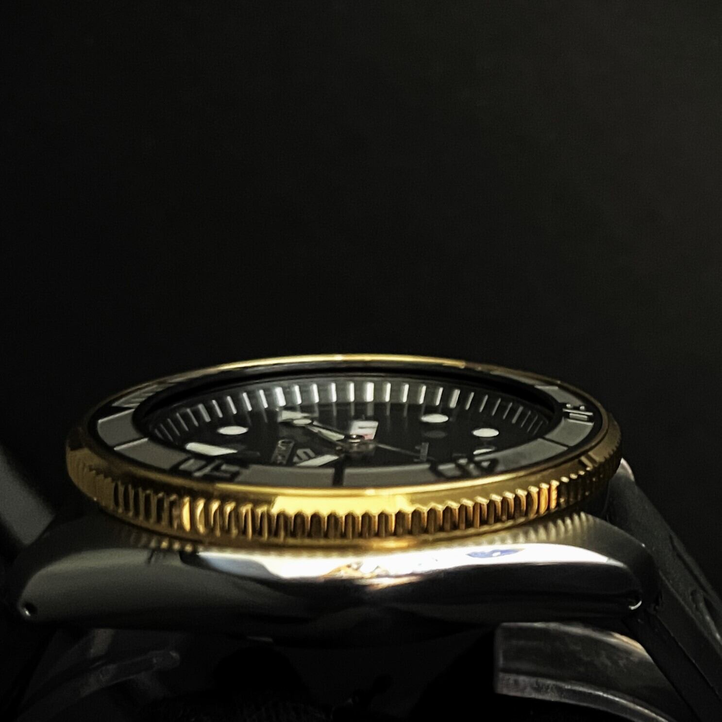 ご購入頂いたSEIKO5Sportsブラックフェイスに、ゴールドカラーのコインエッジベゼルを装着し、そこにセラミック製の サブマリーナリバースタイプ(ブラック)をセット、ベルトには オーシャンレーサータイプのシリコンラバーバンドを選択し、スポーティ&ゴージャスな印象のmod企画です。