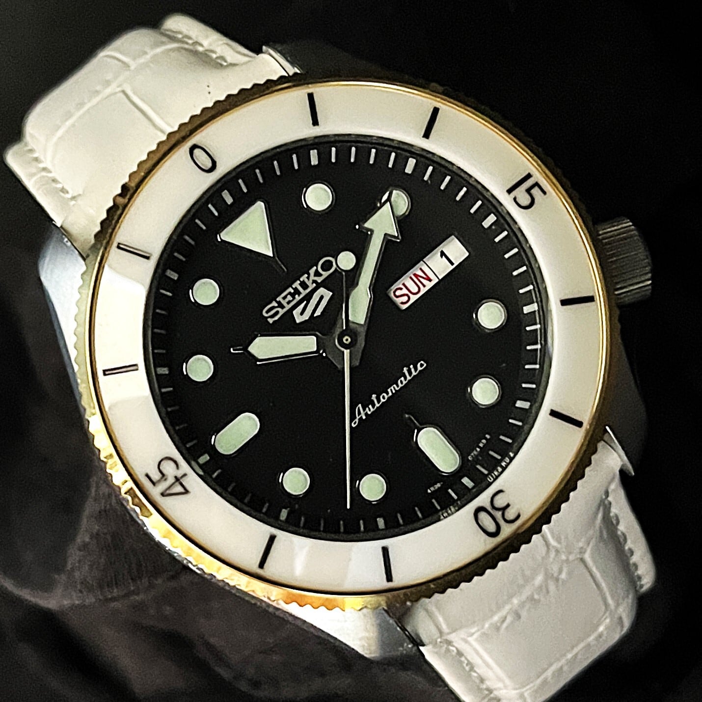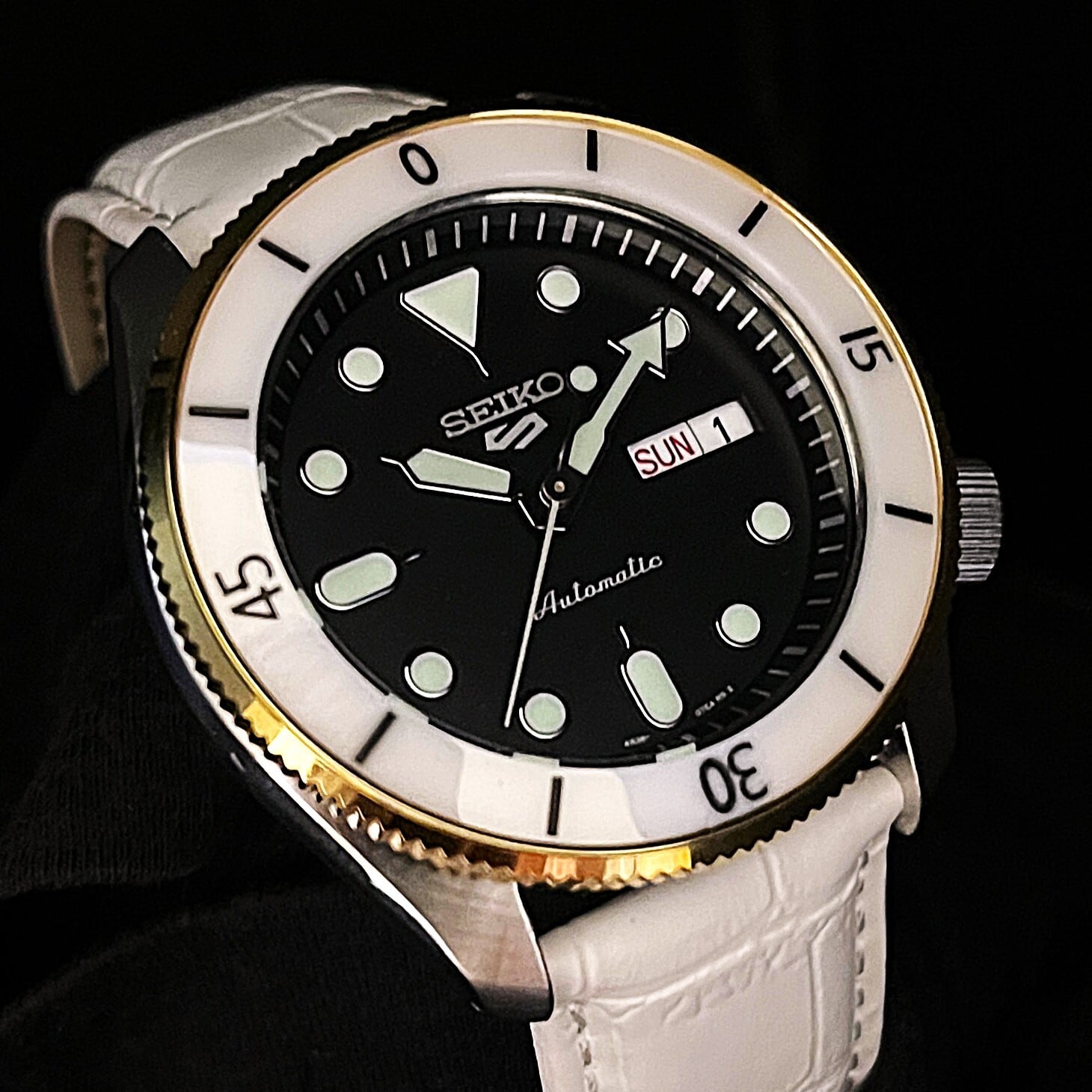 ご購入頂いたSEIKO5Sportsブラックフェイスに、ゴールドのコインエッジベゼルを組込み、J12タイプ(ホワイト)のセラミックベゼルインサートをセット、そこに型押しホワイトの本革ベルトを仕込んだエレガントな印象のmod企画です。
