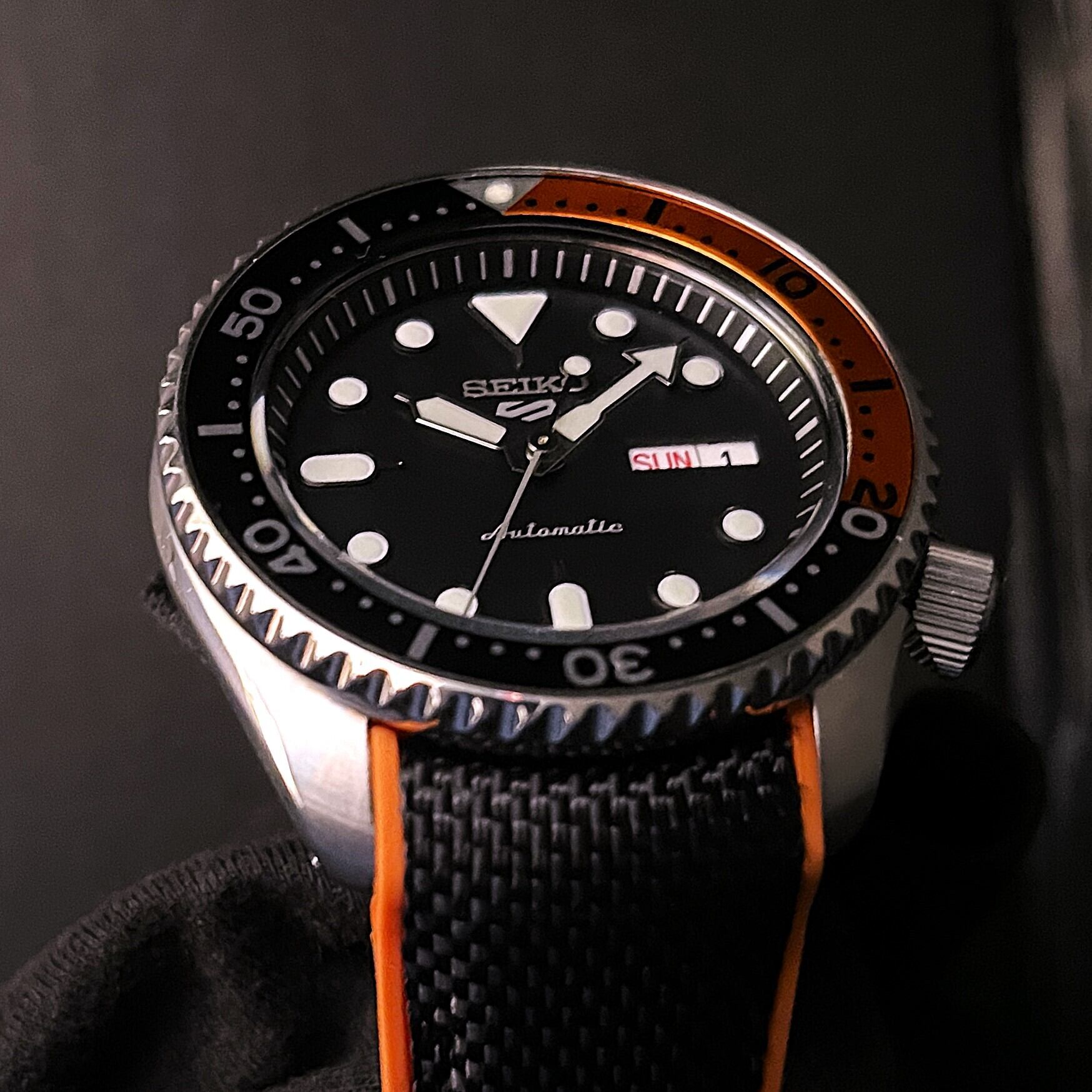 ご購入頂いたSEIKO5Sportsブラックフェイスに、サブマリーナタイプベゼル(シルバーポリッシュ)にSEIKO純正デザインフラットベゼルインサート(ブラック・オレンジ)をセットし、ダイヤステッチナイロン&シリコンラバーバンド(ブラック・オレンジ)を合わせた、鮮やかでスポーティなイメージのカスタム企画です。