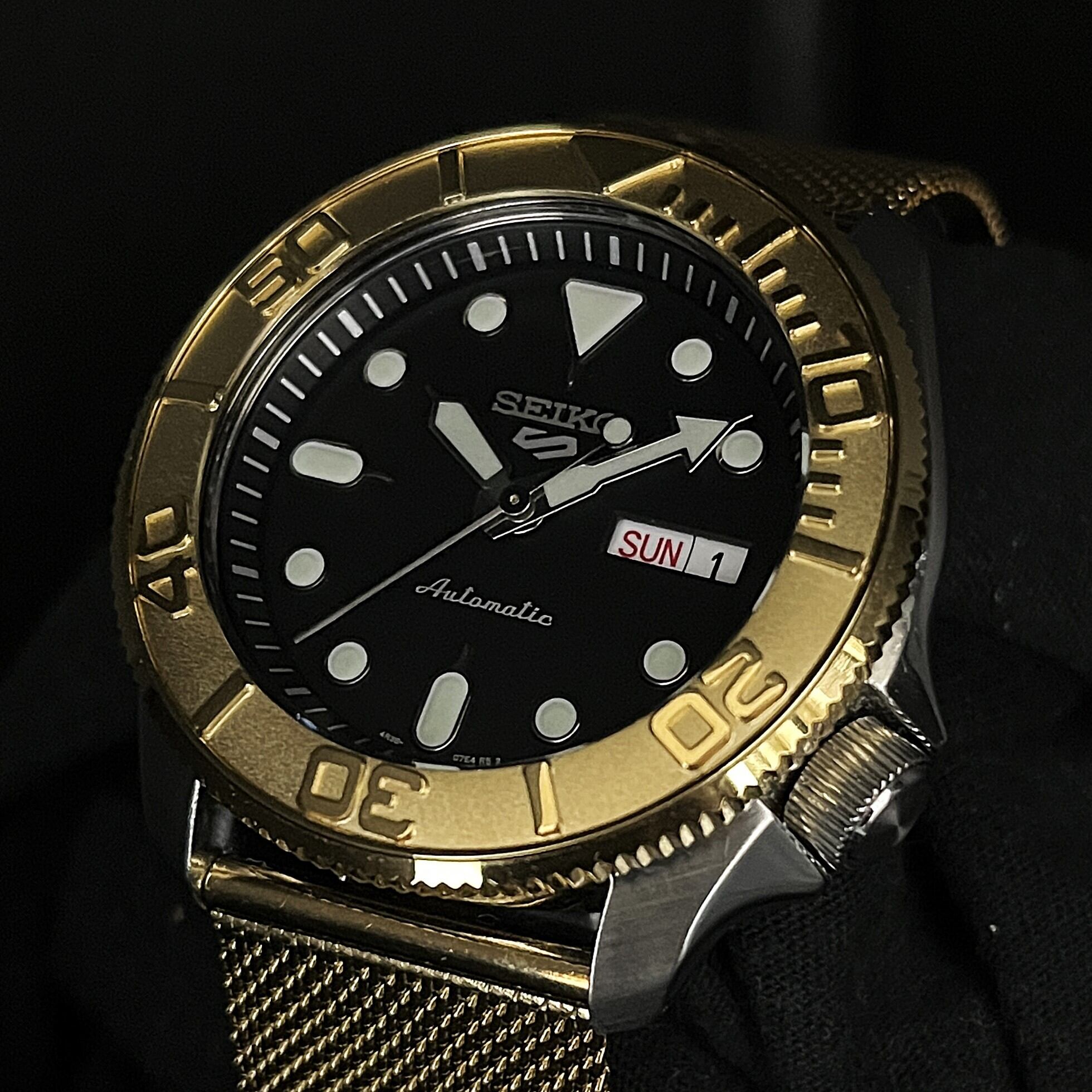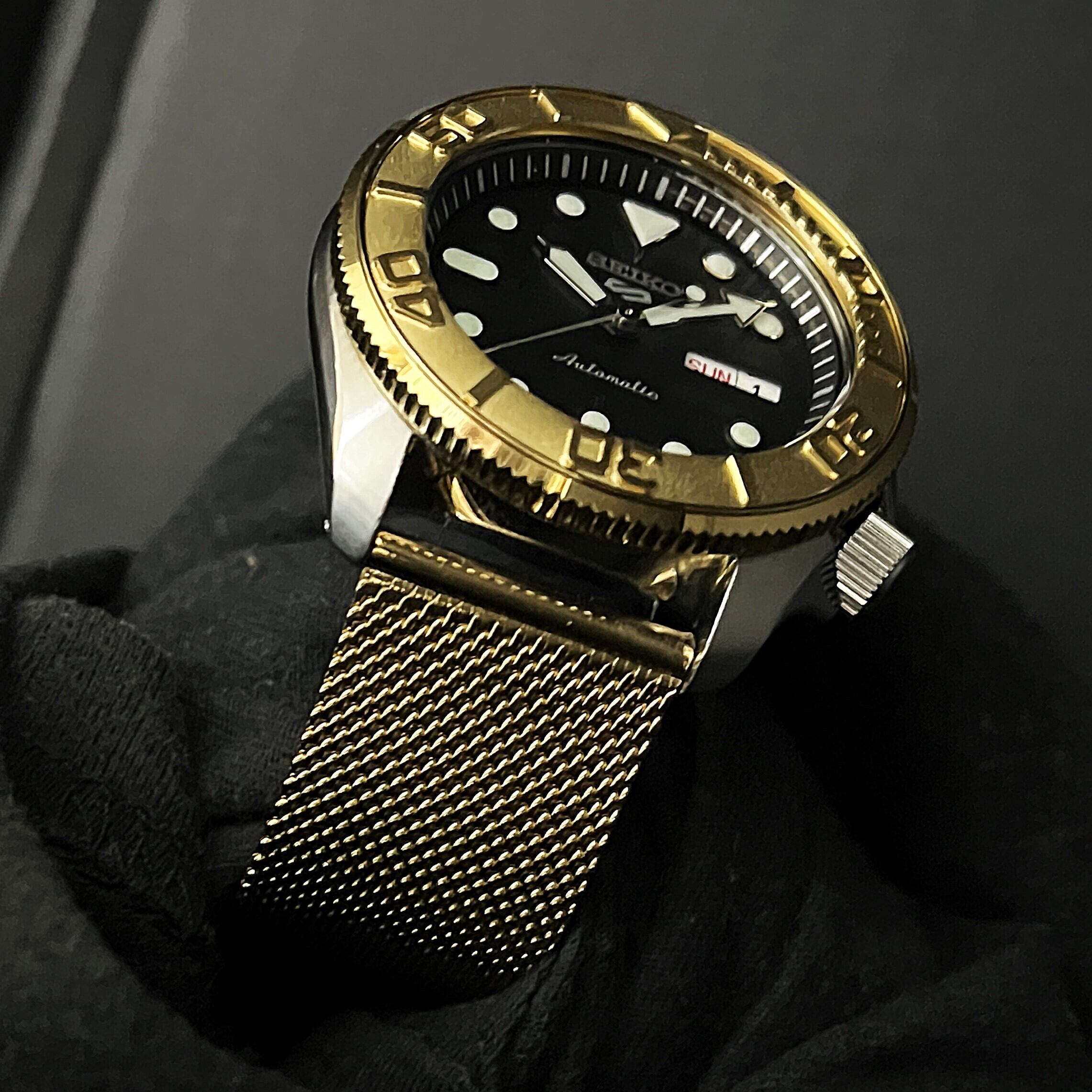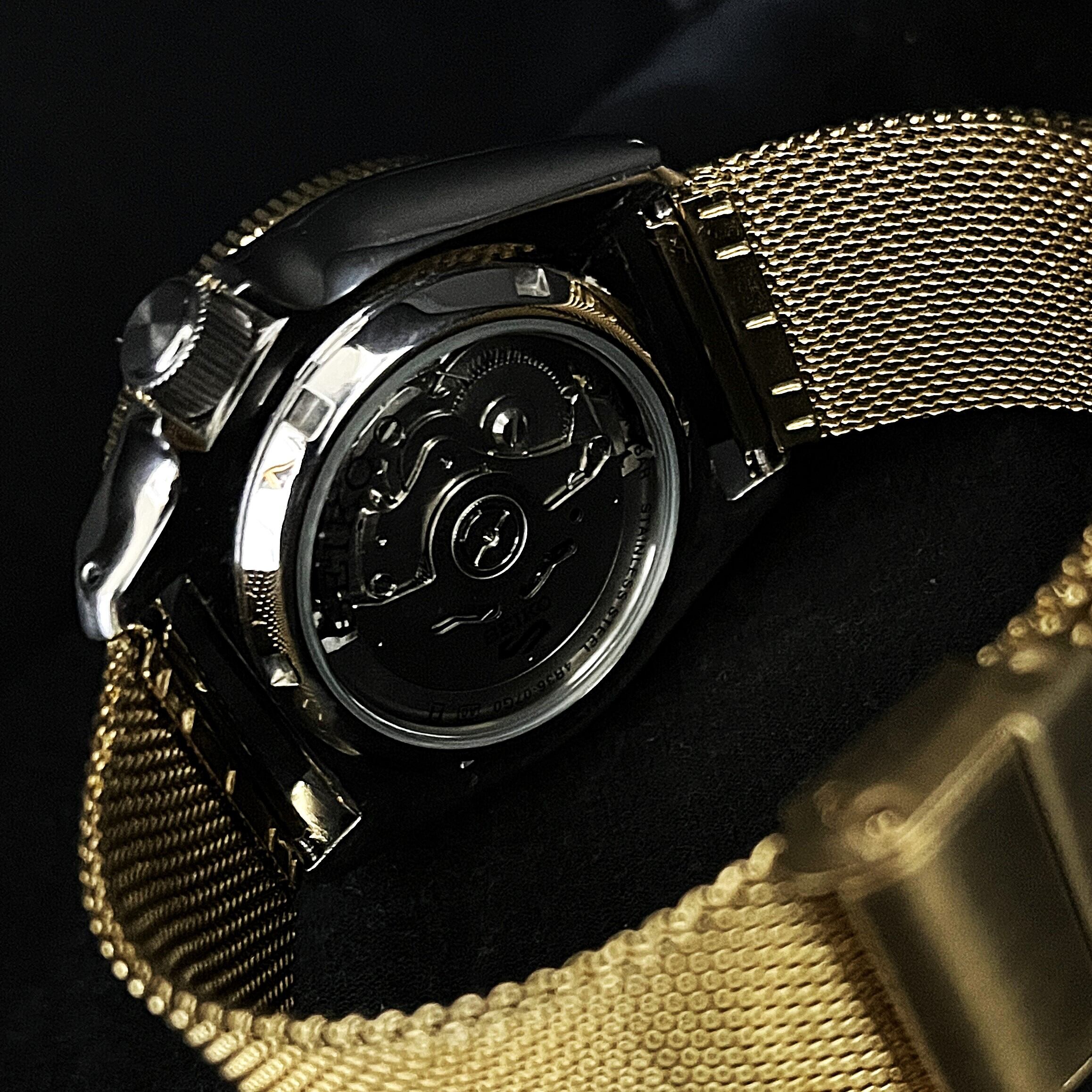 ご購入頂いたSEIKO5Sportsブラックフェイスに コインエッジベゼル(ゴールド)とヨットマスタータイプベゼル(ゴールド)をあわせ、さらにステンレスメッシュベルト(ゴールド)を装着した、ゴージャスな雰囲気を纏ったカスタム企画です。
