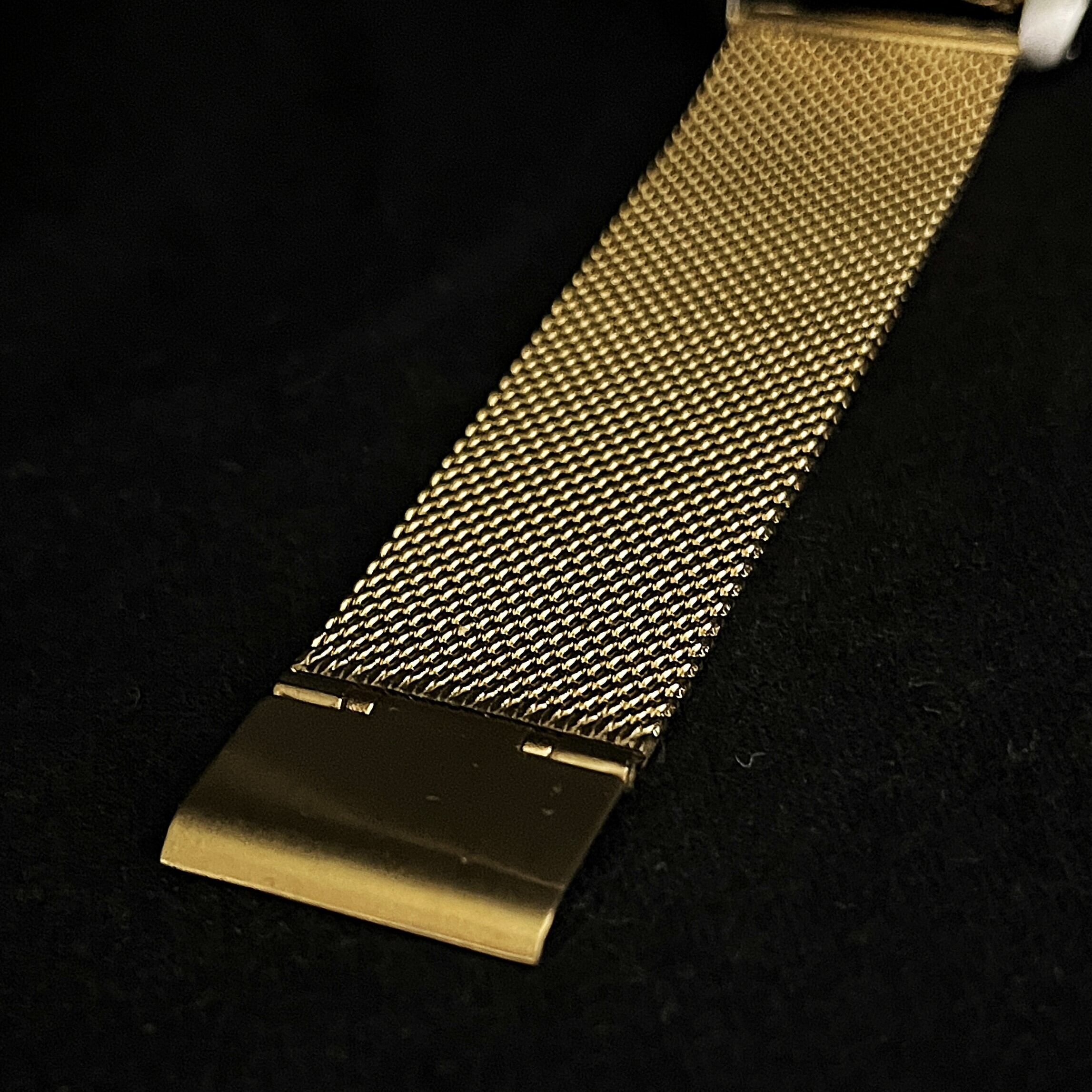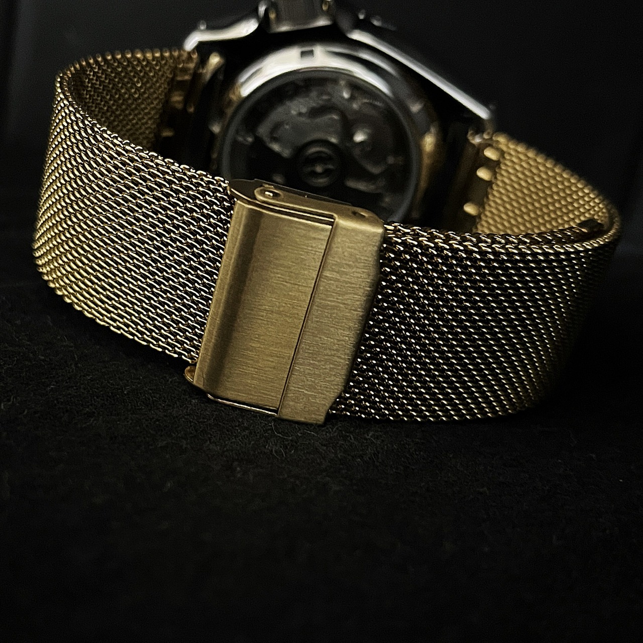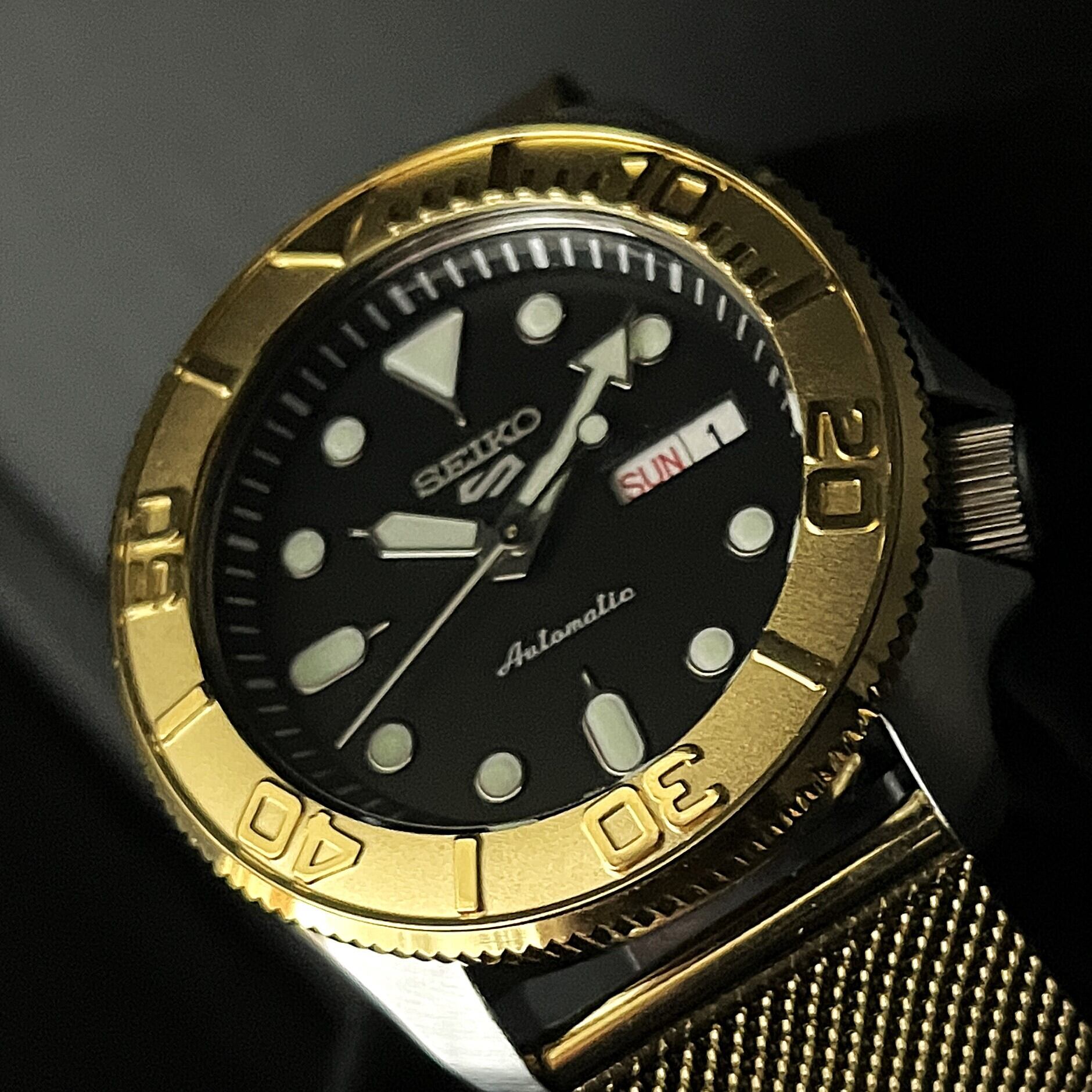 ご購入頂いたSEIKO5Sportsブラックフェイスに コインエッジベゼル(ゴールド)とヨットマスタータイプベゼル(ゴールド)をあわせ、さらにステンレスメッシュベルト(ゴールド)を装着した、ゴージャスな雰囲気を纏ったカスタム企画です。